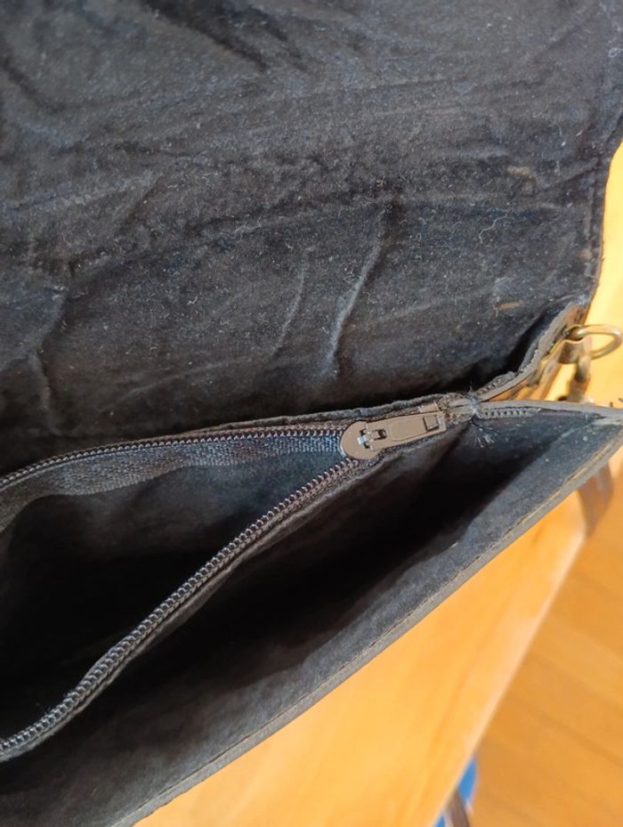 Pochette vintage , Sac à main ,vernis Intérieur velours légèrement froissé. Légères traces peu visibles. 2 compartiments à fermeture + une petite poche à fermeture. Rabat matelassé. Mesures Hauteur 17cm largeur 26cm Hauteur sangle 48cm