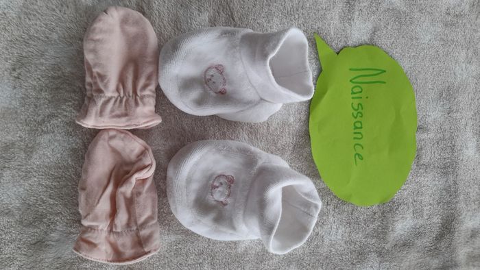 Chaussons blancs et petit ours rose, et gants roses antigriffures
