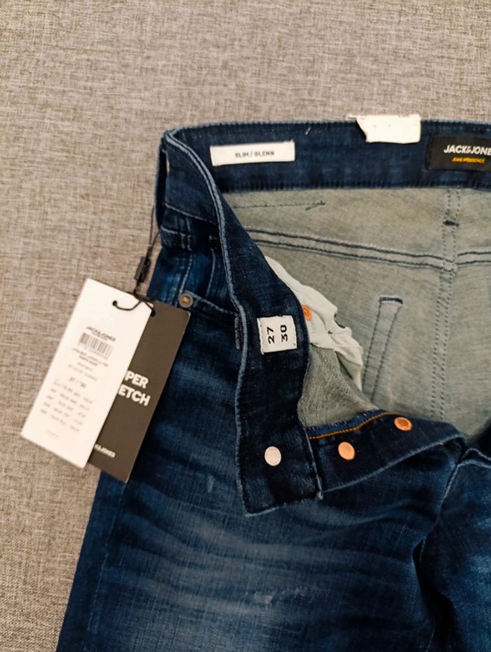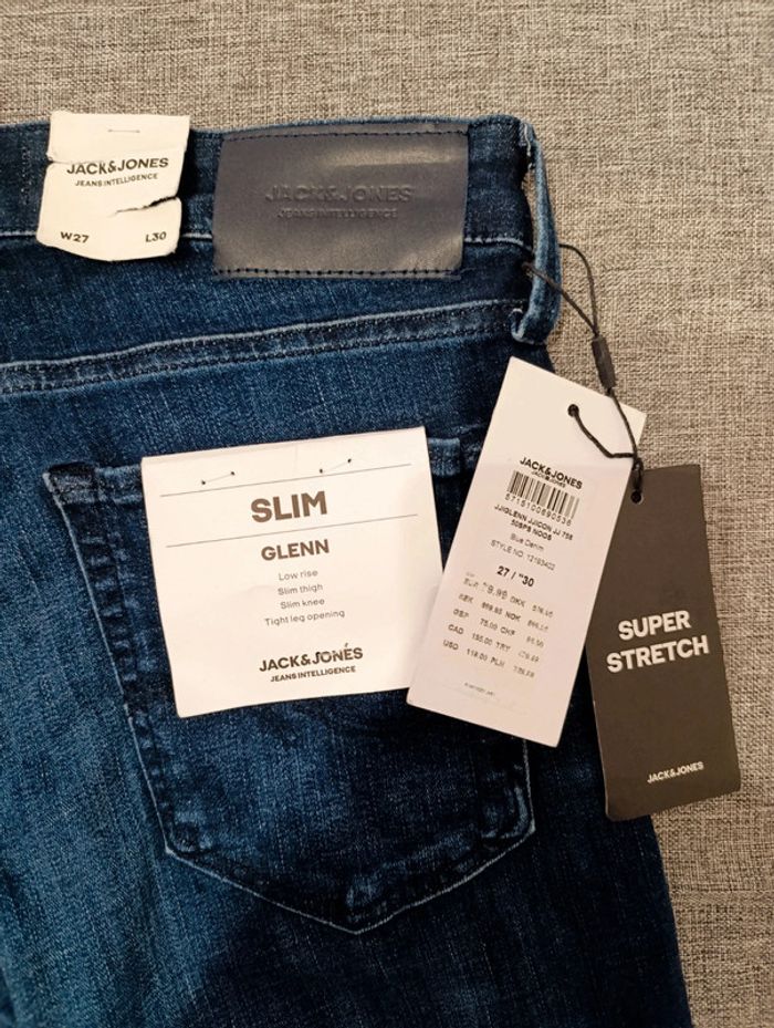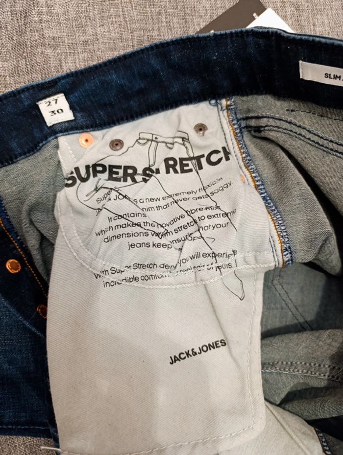 Jeans slim Jack&Jones W27L30 NEUF Super stretch, fermeture à bontons. Couleur bleu, coupe homme, valeur 80€ 📦 Emballage soigné et envoi rapide 📤 Préférence avec Mondial sinon me prévenir 🚭 Maison non fumeur 👛 Réduction sur les achats en lot #reductionsurleslots #cadeaudenoel #cadeau #pâque