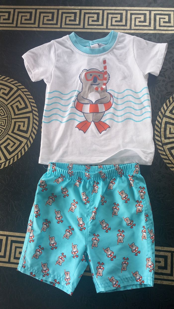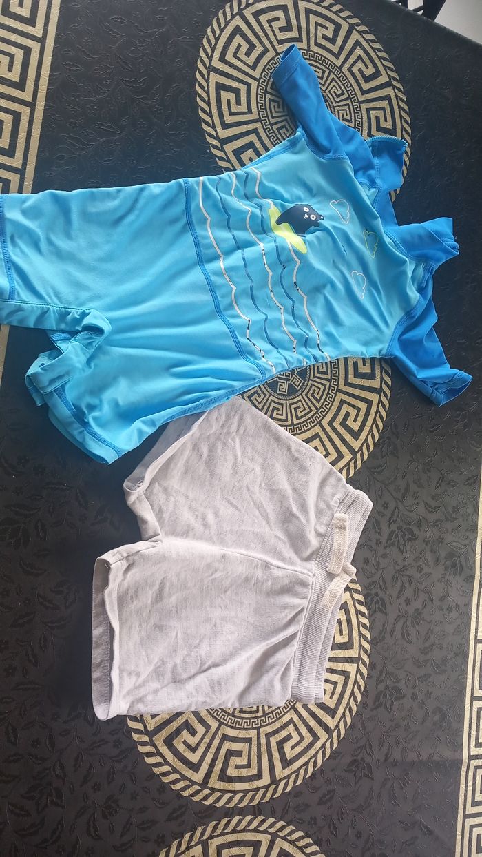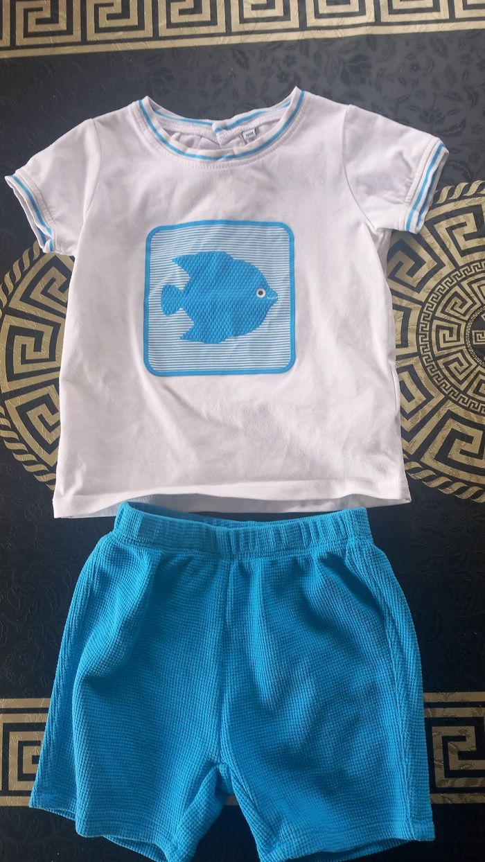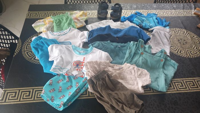 Lot 18 mois ou 86 cms allant de bon état à très bon etat: 4 ensembles short et haut (petite tâche à enlever sur le blanc avec le poisson) 1 salopette short gemo 4 tee shirt 1 short 1 combi piscine offerte car plusieurs défauts Sandales kiabi taille 22 Vous trouverez aussi dans mon dressing des lots de bodies à manches courtes et sans manches.