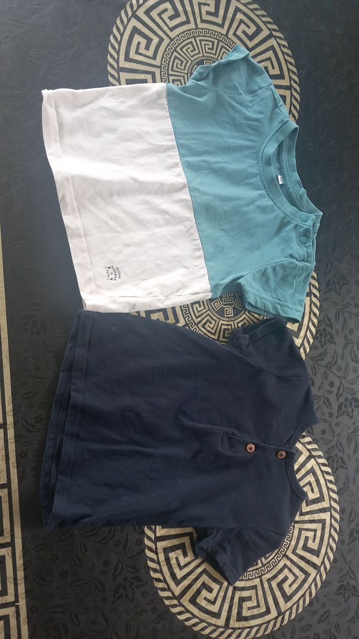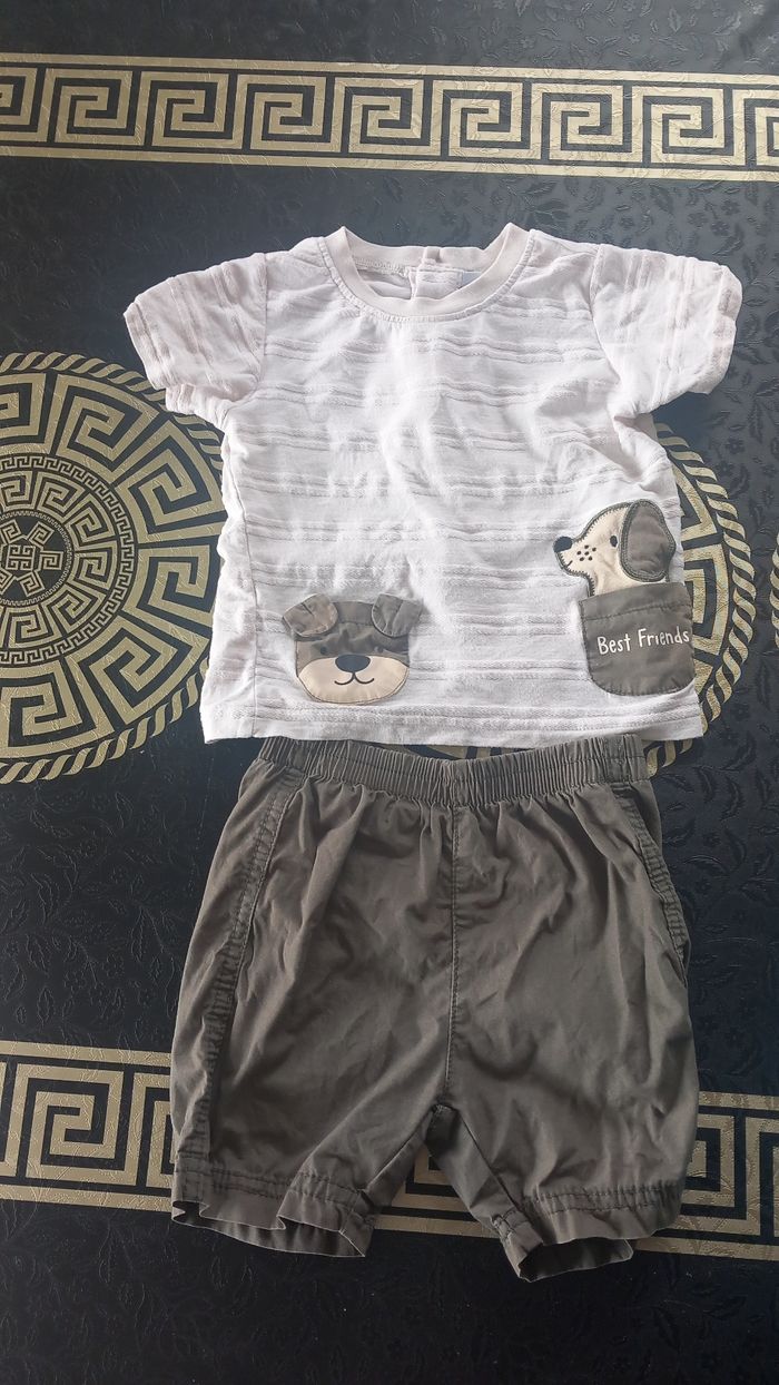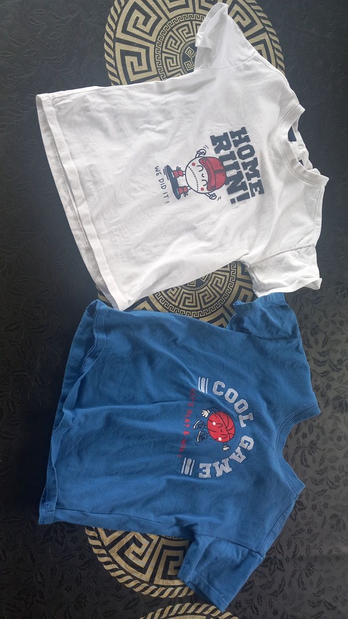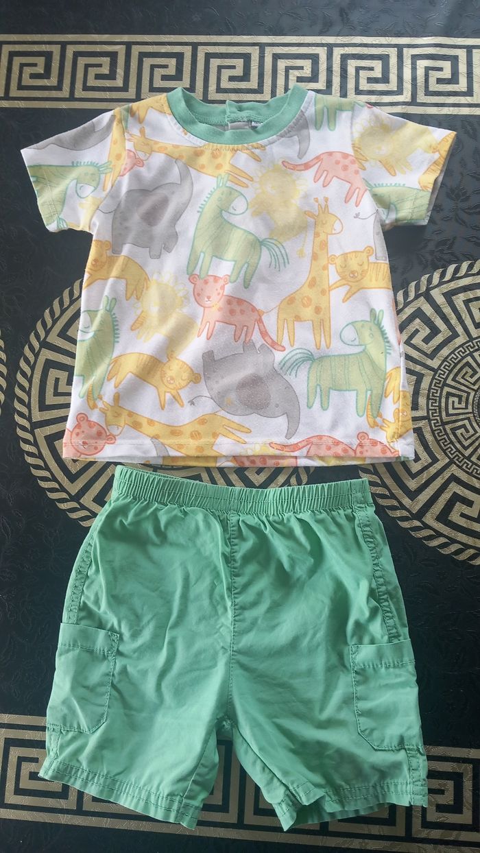 Lot 18 mois ou 86 cms allant de bon état à très bon etat: 4 ensembles short et haut (petite tâche à enlever sur le blanc avec le poisson) 1 salopette short gemo 4 tee shirt 1 short 1 combi piscine offerte car plusieurs défauts Sandales kiabi taille 22 Vous trouverez aussi dans mon dressing des lots de bodies à manches courtes et sans manches.