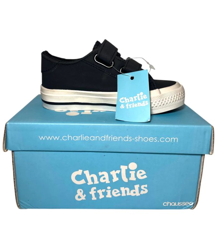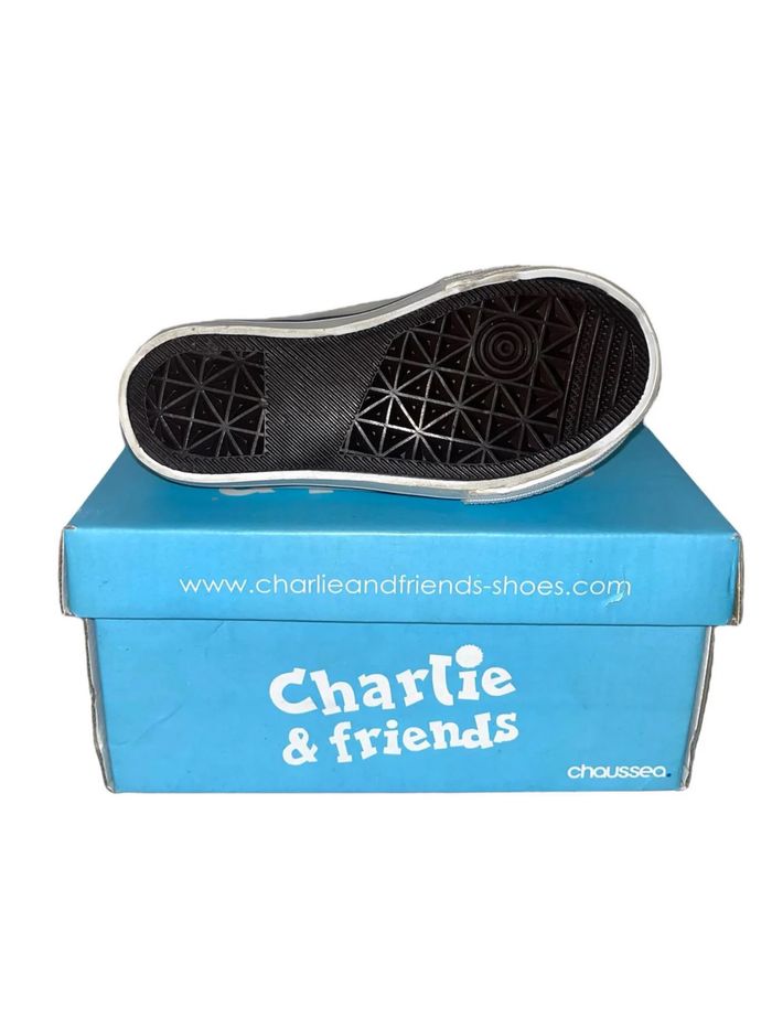 Baskets enfant de la marque Charlie & Friends, en noir et blanc, avec fermeture à scratch pour un enfilage facile. Taille 25. Confortables et pratiques, elles sont idéales pour accompagner les petits dans toutes leurs aventures. Design moderne et adapté aux pieds des enfants.