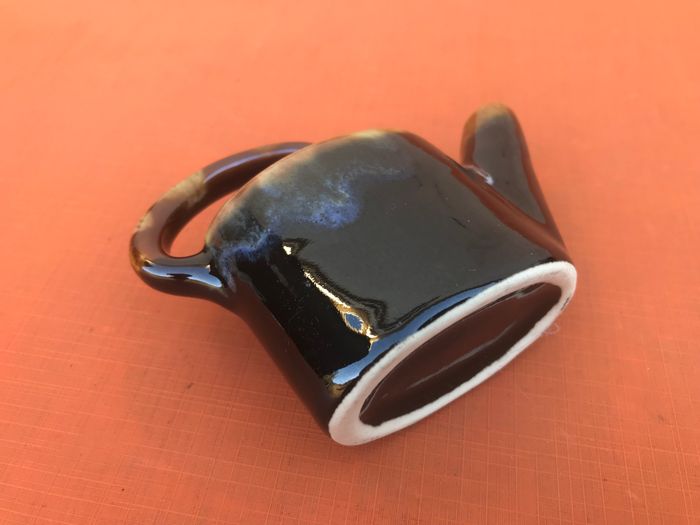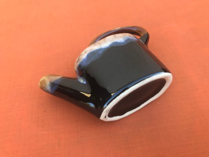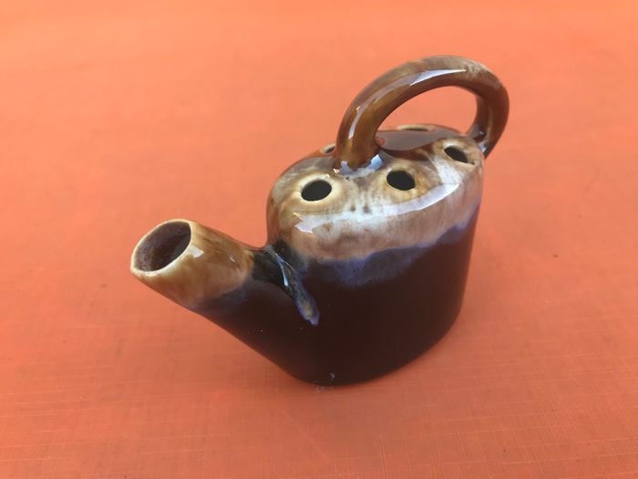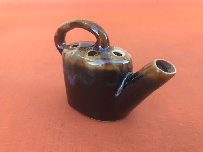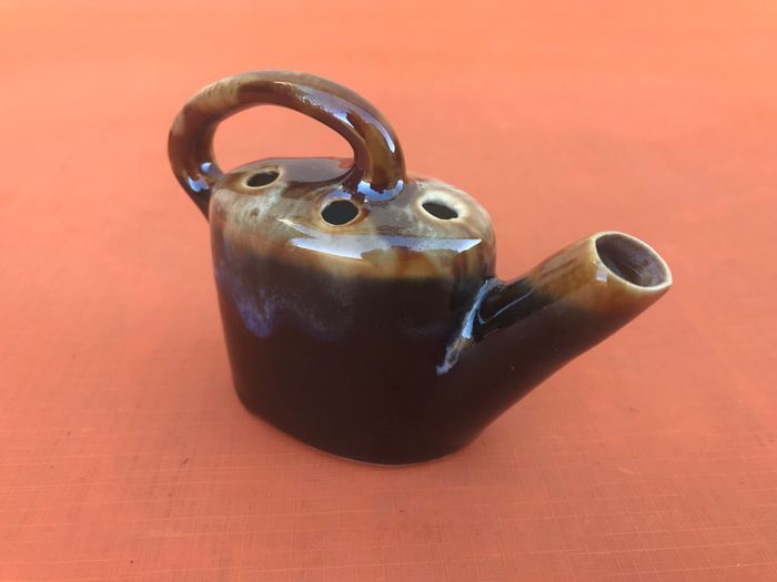 Années 1950 Bouquetière / Pique fleurs forme arrosoir Grès flammé " grand feu " dans le goût de Vallauris Hauteur : 75mm Longueur : 110mm Poids : 80grs