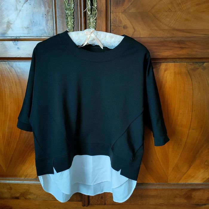 Haut femme taille unique, t-shirt manches 2/3, effet 2 en 1 chemise et pull. Très peu porté. #hautfemme #femmetailleunique #hautfemmetailleunique #2en1femme #tshirtchemisefemme