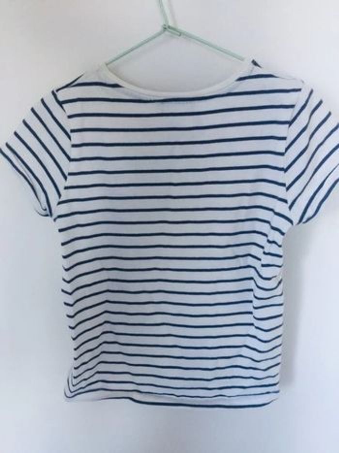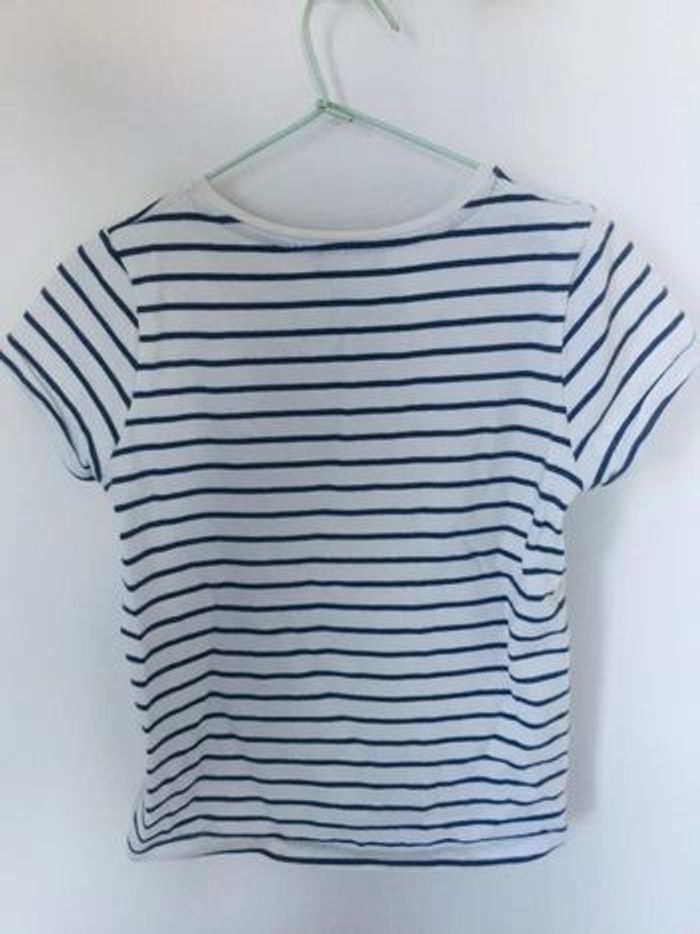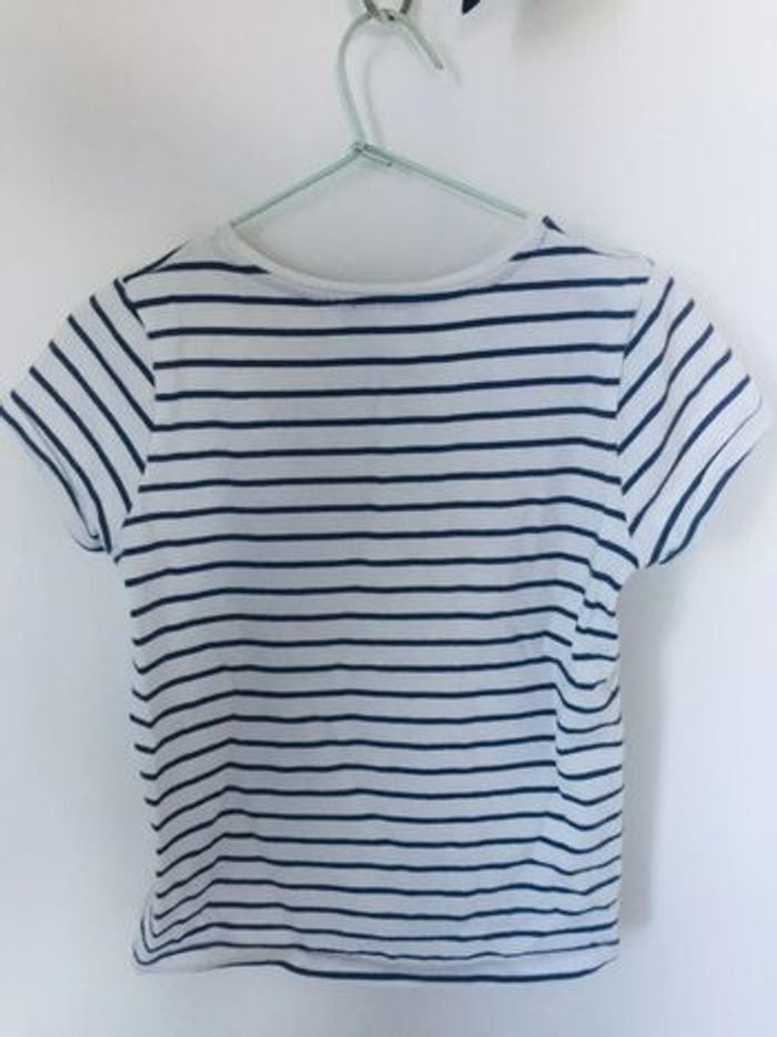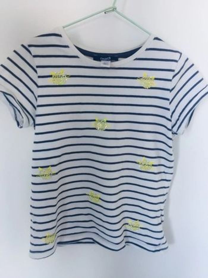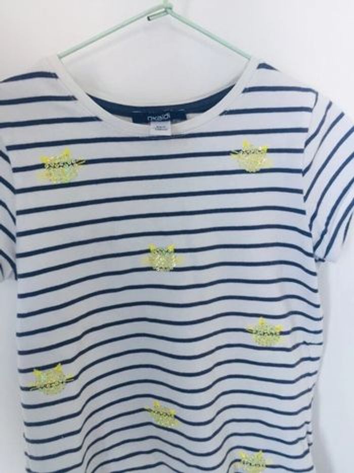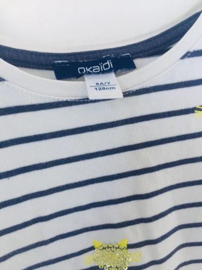 Achat aujourd’hui ? 👉🏻 Départ du 📦 demain ! t-shirt marinière chat en sequins jaune 8 ans / 128 cm blanc et bleu vêtement été - haut - plage - détente - mignon- kawai - cute - marque okaidi Retrouvez tous les Vêtements 8 ans que je vends: #8ansmg