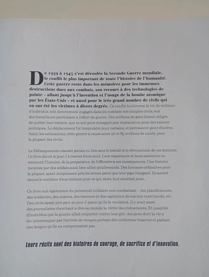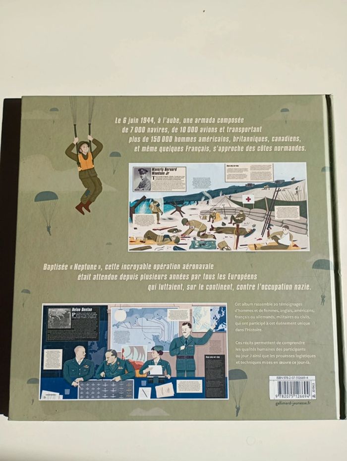 Le 6 juin 1944, à l'aube, une armada composée de 7000 navires, de 10000 avions et transportant plus de 150000 hommes américains, britanniques, canadiens, et même quelques Français, s'approche des côtes normandes. Baptisée "Neptune", cette incroyable opération aéronavale était attendue depuis plusieurs années par tous les Européens qui luttaient, sur le continent, contre l'occupation nazie. Cet album rassemble 20 témoignages d'hommes et de femmes, anglais, américains, français ou allemands, militaires ou civils, qui ont participé à cet événement unique dans l'Histoire. Ces récits permettent de comprendre les qualités humaines des participants au jour J ainsi que les prouesses logistiques et techniques mises en oeuvre ce jour-là. Éditeur ‏ : ‎ Gallimard Jeunesse Broché ‏ : ‎ 48 pages Âge de lecture ‏ : ‎ 8 - 13 ans Dimensions ‏ : ‎ 30.5 x 1.1 x 30.5 cm Livre en très bon état #secondeguerremondiale #débarquement #livredocumentaire #témoignages #histoire #juin44 #normandie #guerre