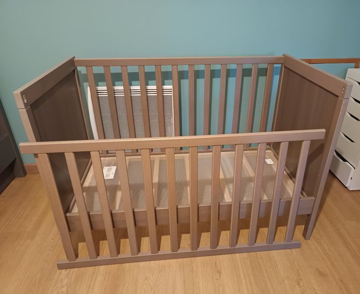 Lit bébé ikea modèle sundvik. Couleur gris brun. Deux hauteurs de matelas et côté amovible pour plus d'autonomie pour l'enfant. Voir autre annonce pour 2 ème lit couleur blanc.