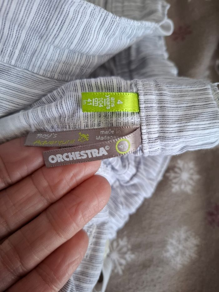Bonjour 👋, short "Orchestra" taille 4 ans, élastique réglable à la taille, couleur gris/blanc, 2 poches devant, 100% coton. Très bon état 4€. Très bon état