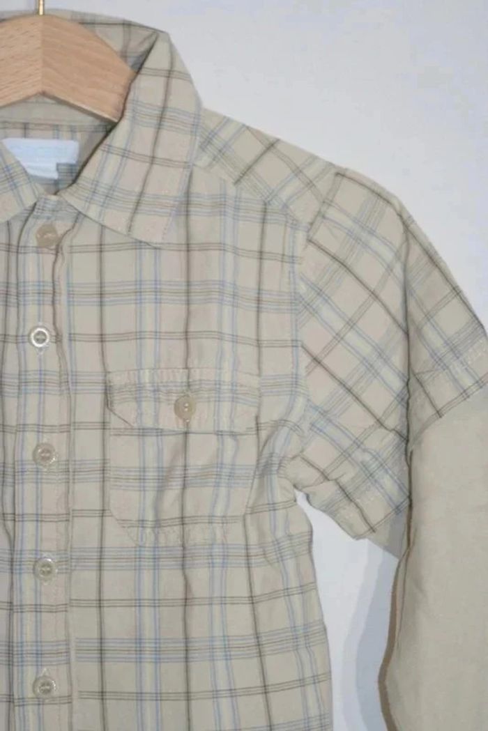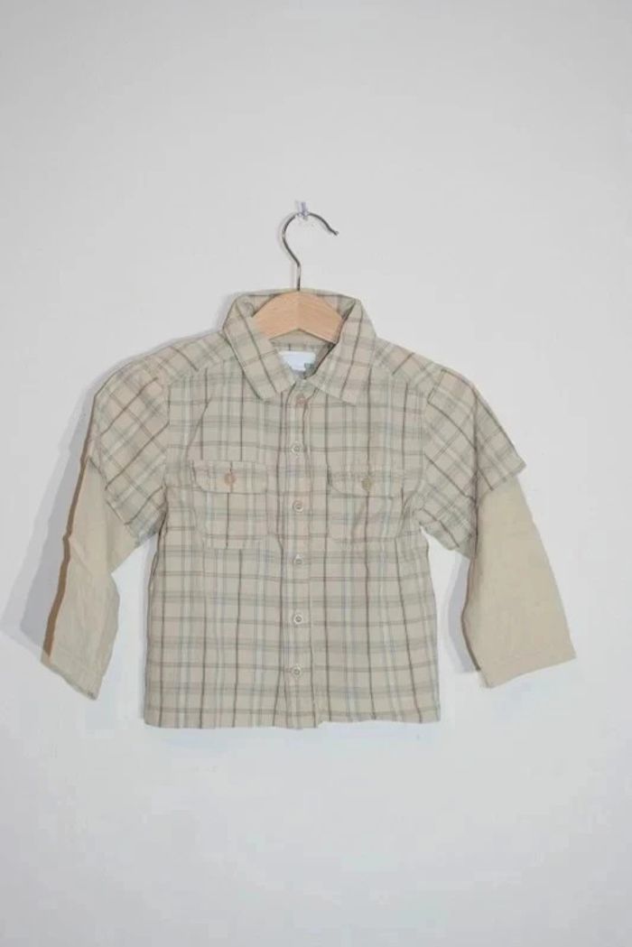 Chemise à carreaux beige marque Obaibi de chez Okaidi, doublure tee-shirt sur les manches, taille 23m, 90g