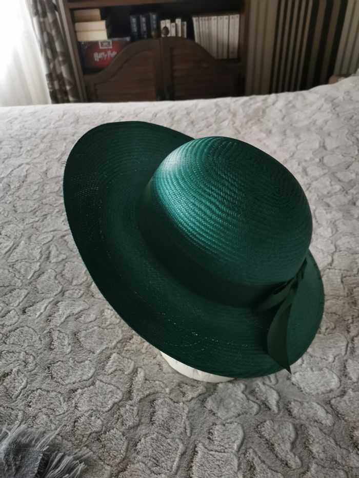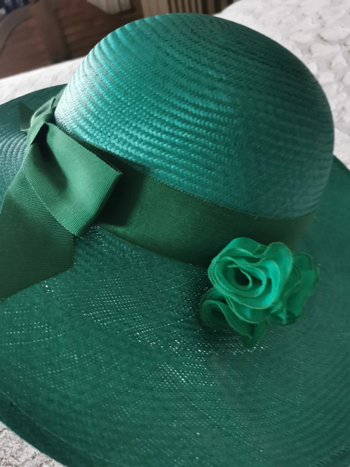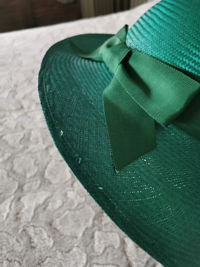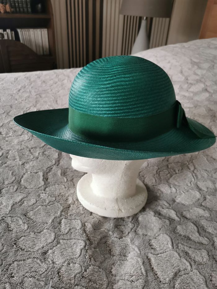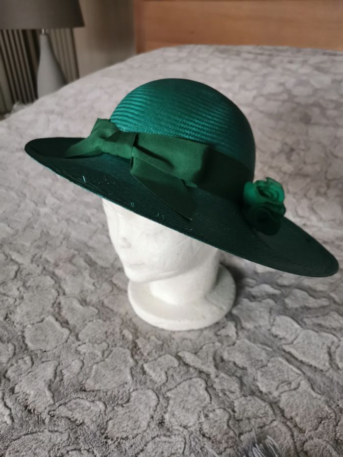 Chapeau vert émeraude vintage, en très bon état général, avec une jolie fleur et le noeud papillon, chapeau en paille teinte et ciré, je pense, je ne pense pas que c'est du plastique, tour de tête 55 cm, hauteur 10 cm, largeur des bords 6,5-11 cm, poids 60g. Bel article. #chapeauvert #chapeauvintage #chapeauvertemeraude