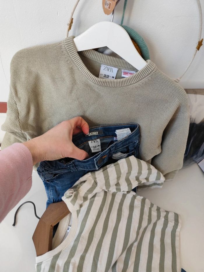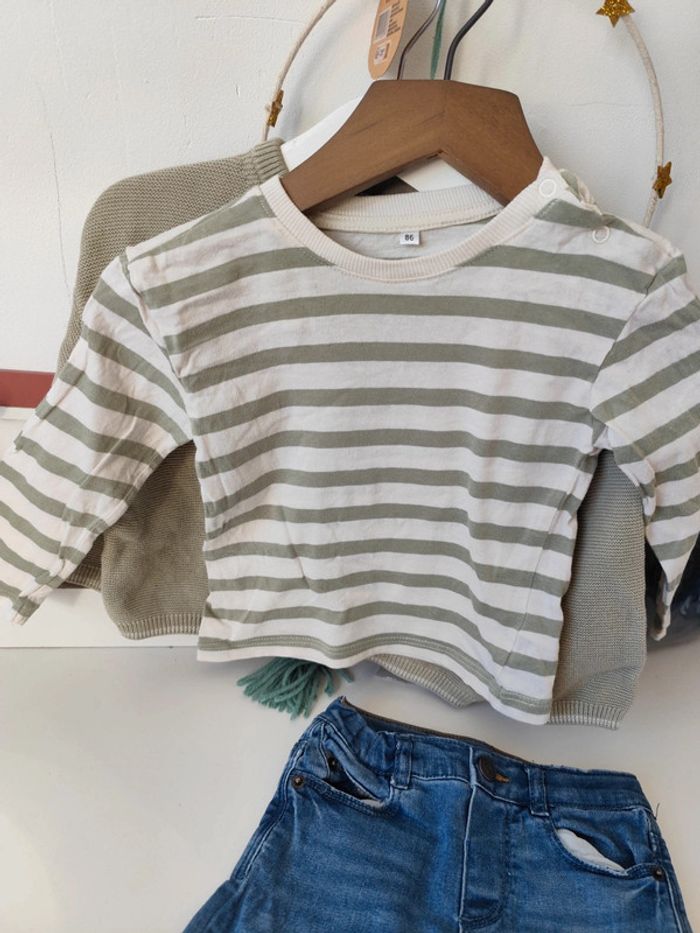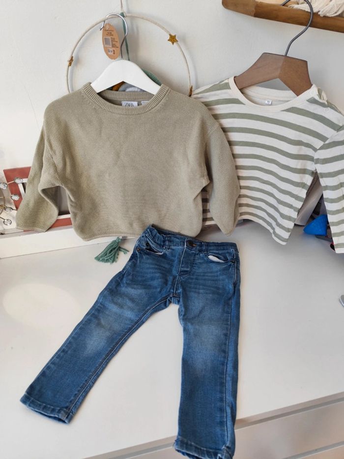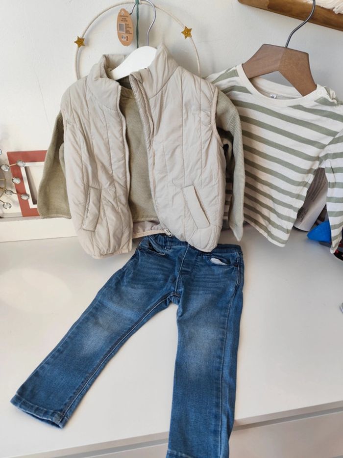 Ensemble composé de 4 pièces : - veste sans manche grise 86cm neuve jamais portée (8€) - pull Zara 12/18mois très bon état (6€) - jeans Zara 12/18mois très bon état (4€) - t-shirt manches longues rayé 86cm tres bon état (3€) Attention si vous faites un lot car le jeans et la veste sont sur d'autres annonces, contactez moi 😜 #elyodress18mois #elyodress12et18mois N'hésitez pas à me suivre, je rajoute régulièrement des nouveautés en Zara h M tao mango Primark sergent major Kiabi Gémo ...