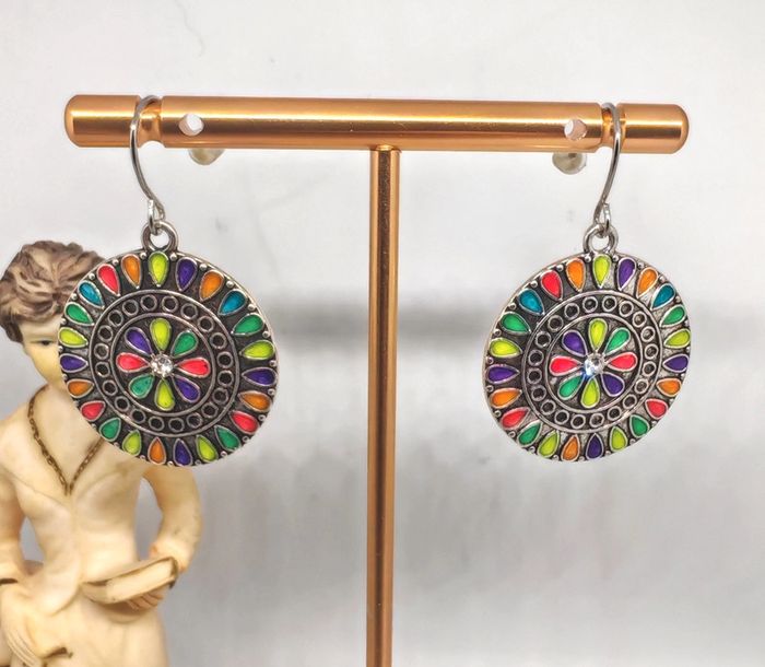 Boucles d'oreilles pendantes ronde 💎 Tendance 🌺 Neuf jamais porté 💖 #bijoux #bouclesdoreilles #tendance #boho #boheme #bohostyle #bohochic #vintage #retro #retrostyle #retrolook #glamour #glam #argenté #multicolor