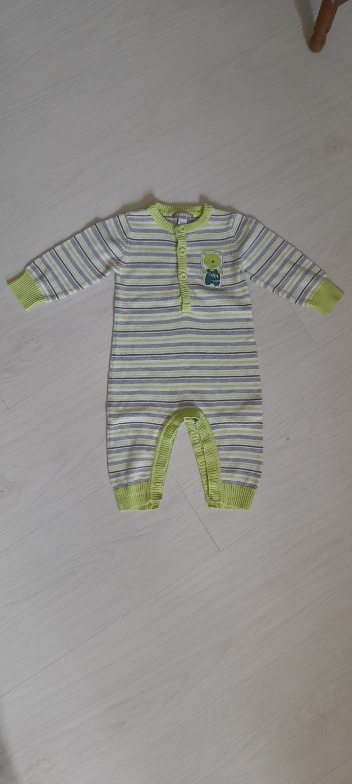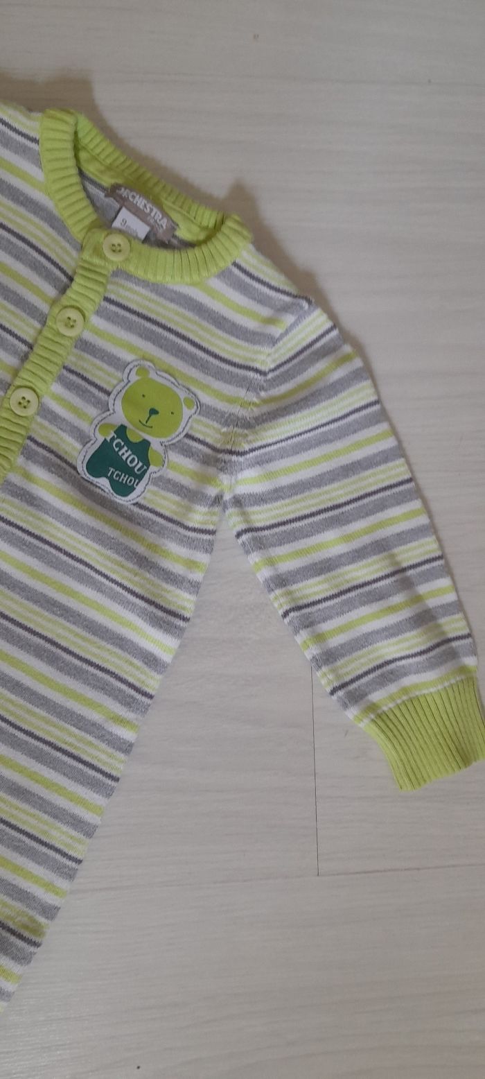 Ensemble 1 pièce T 9 mois Marque ORCHESTRA Couleurs vert clair/ gris et blanc Attache pressions entre jambes et boutons sur mis haut devant Très très bon état