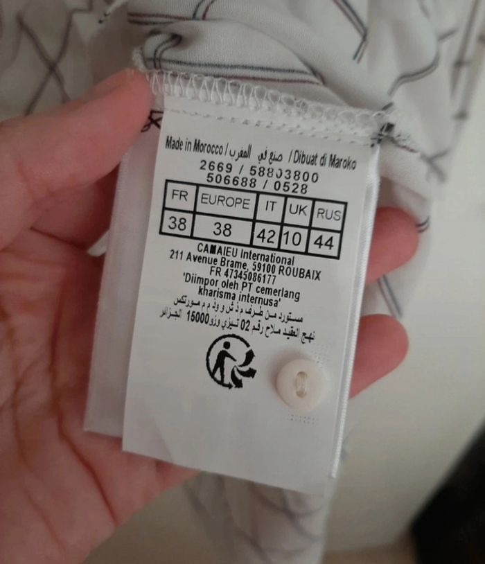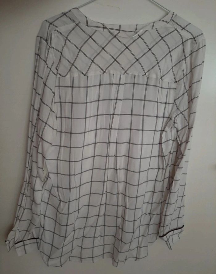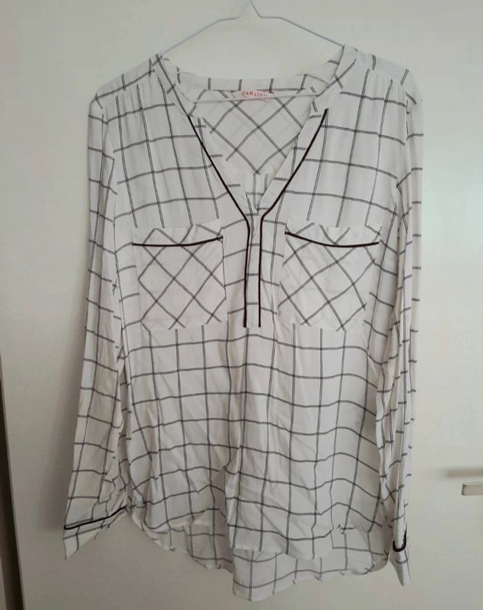 Blouse Camaïeu neuve taille 38. Blanche, carreaux avec ligne dans les tons mauves. Légère et fluide, jamais portée. Je la vends au prix de 15 euros. #TailleM38marine