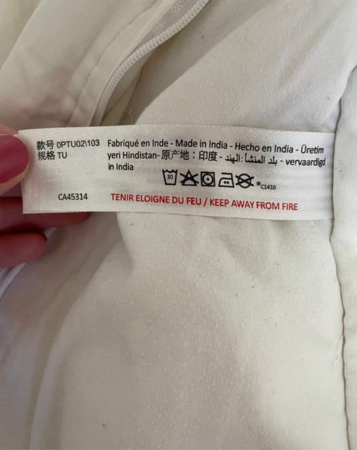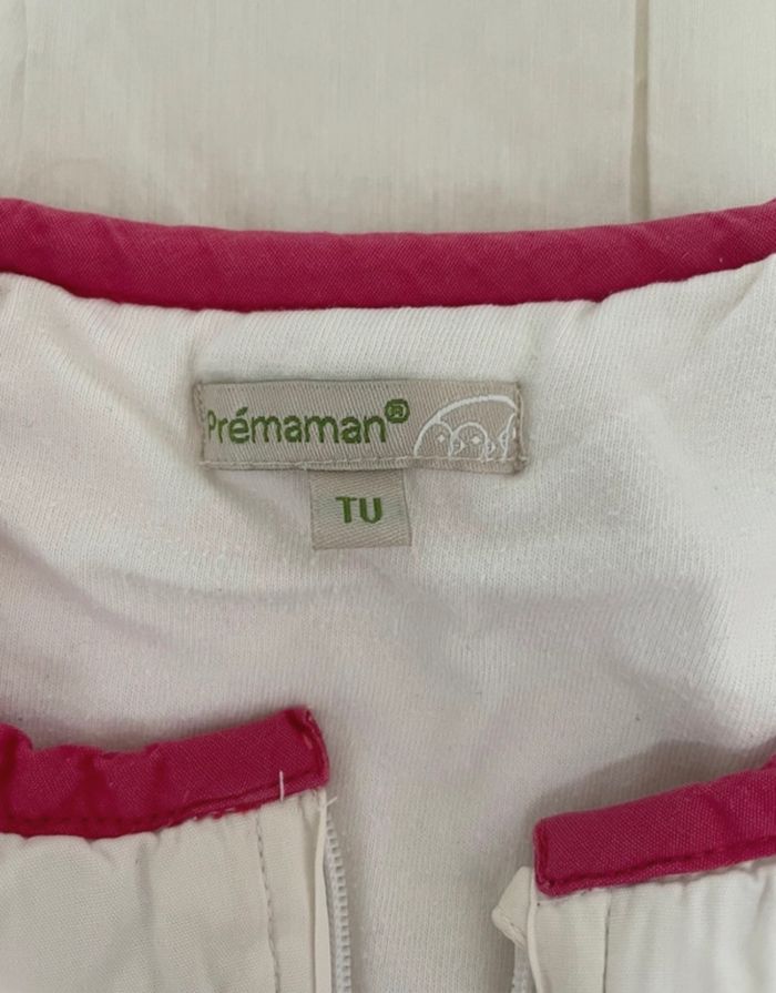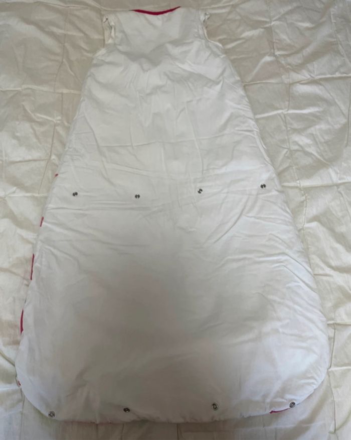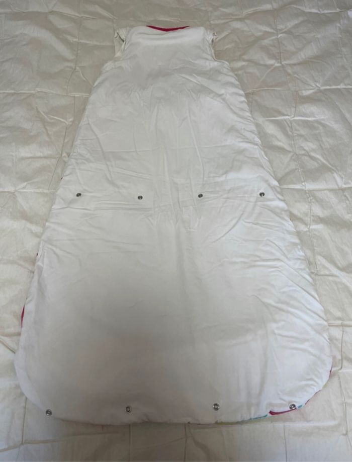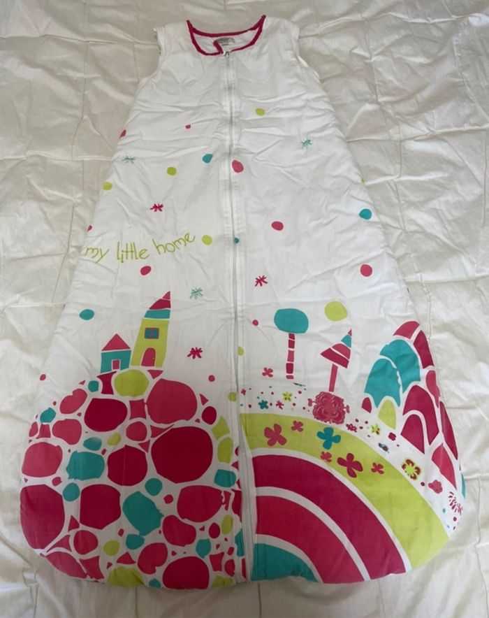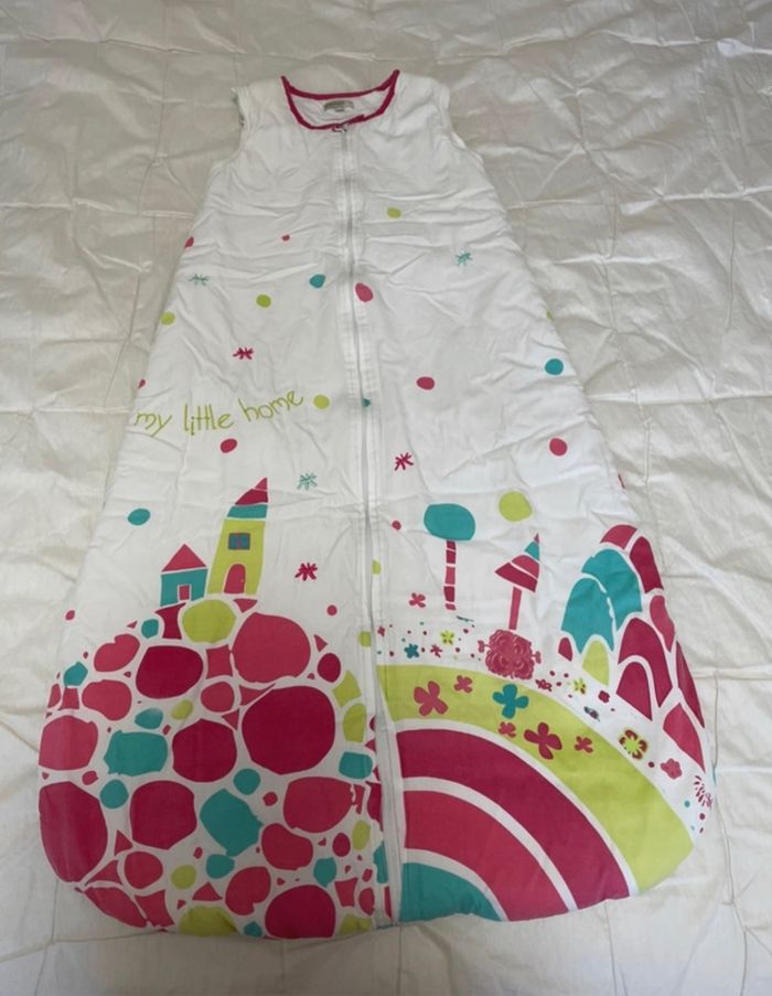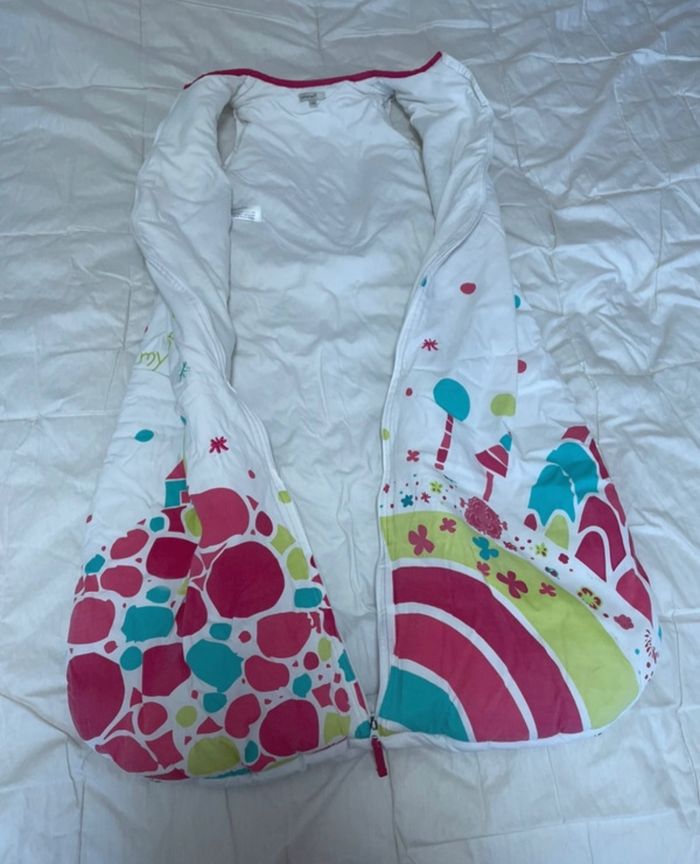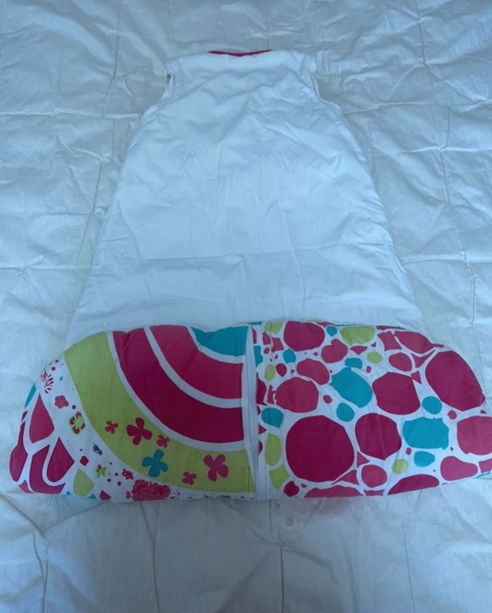 Vends turbulette blanche , avec motifs rouge , rose , vert et bleu , de la marque premaman . La Gigoteuse s’ouvre sur l’avant à l’aide la la fermeture éclaire . Composition 100% coton Je la vends 8 euros.