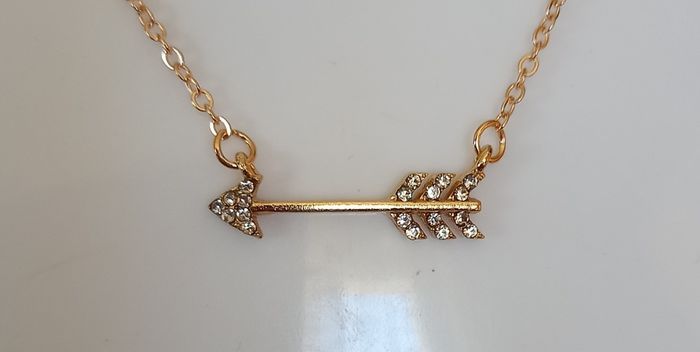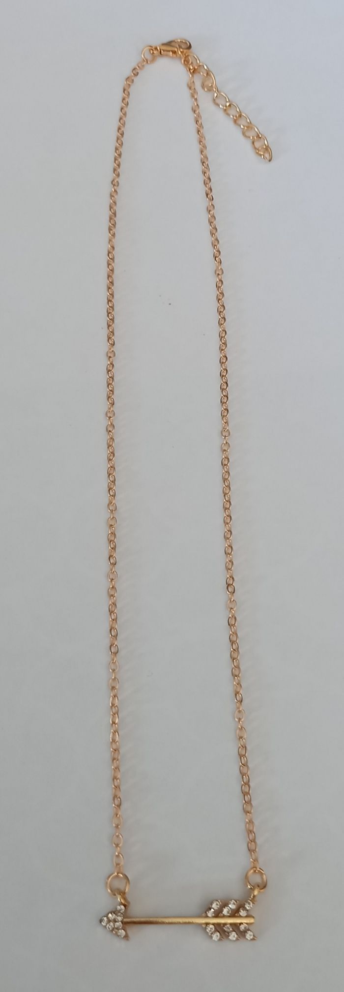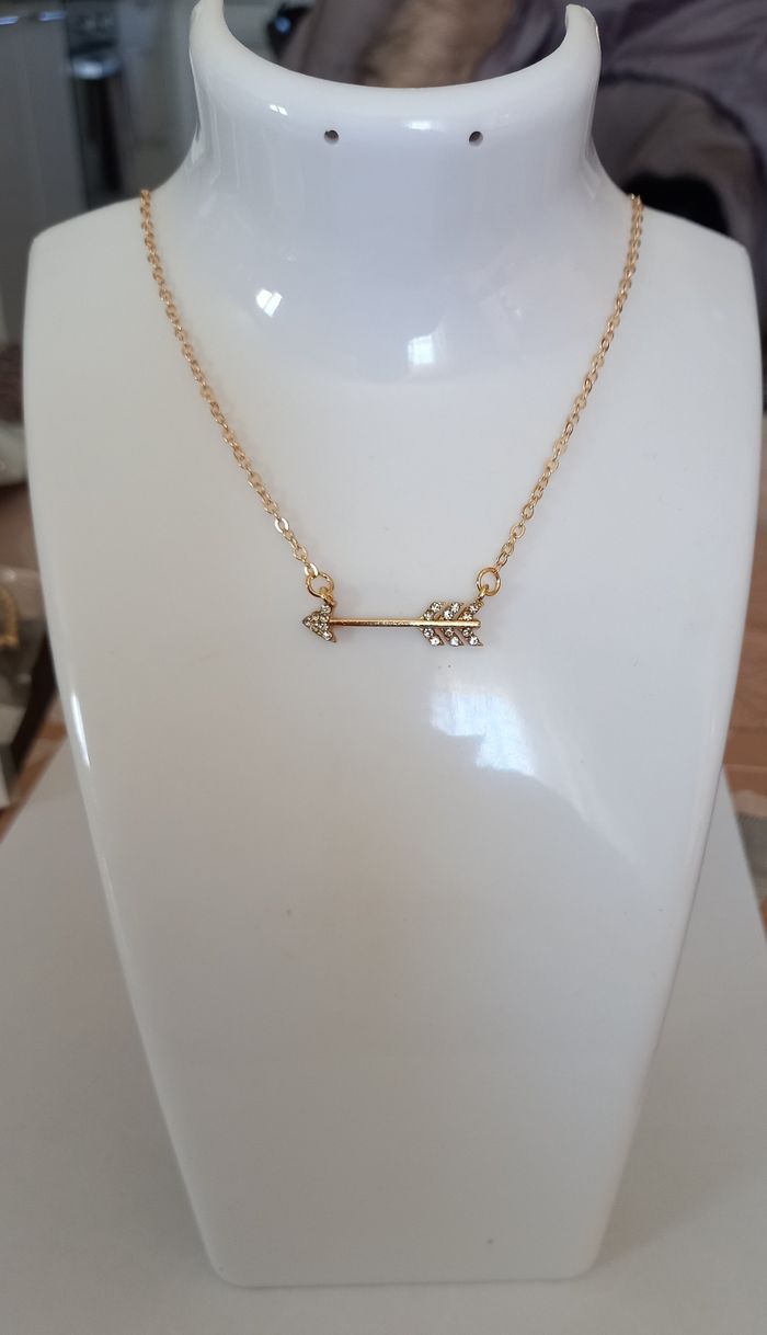 Chaine coloris doré de 40 cms. Dimensions de la flèche sertit de strass : 2,8 x 0,8 cms. Collier neuf sous blister. N'hésitez pas à regarder mes autres ventes. Envoi rapide et soigné.