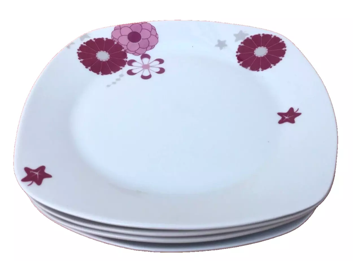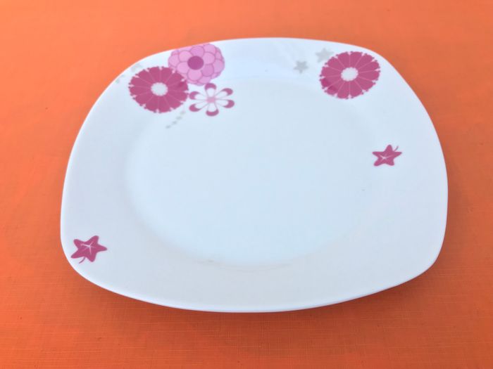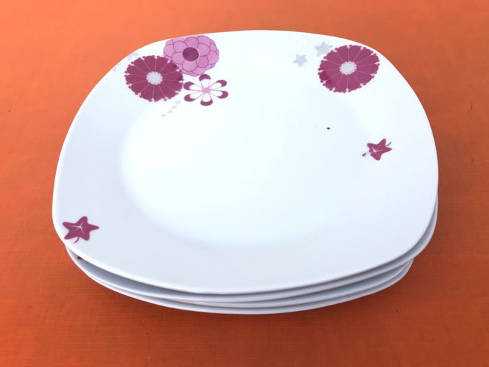 4 assiettes plates en porcelaine La Collection Julia.L Caractère Longueur : 245mm Largeur : 245mm Hauteur : 28mm Poids total : 2kg750