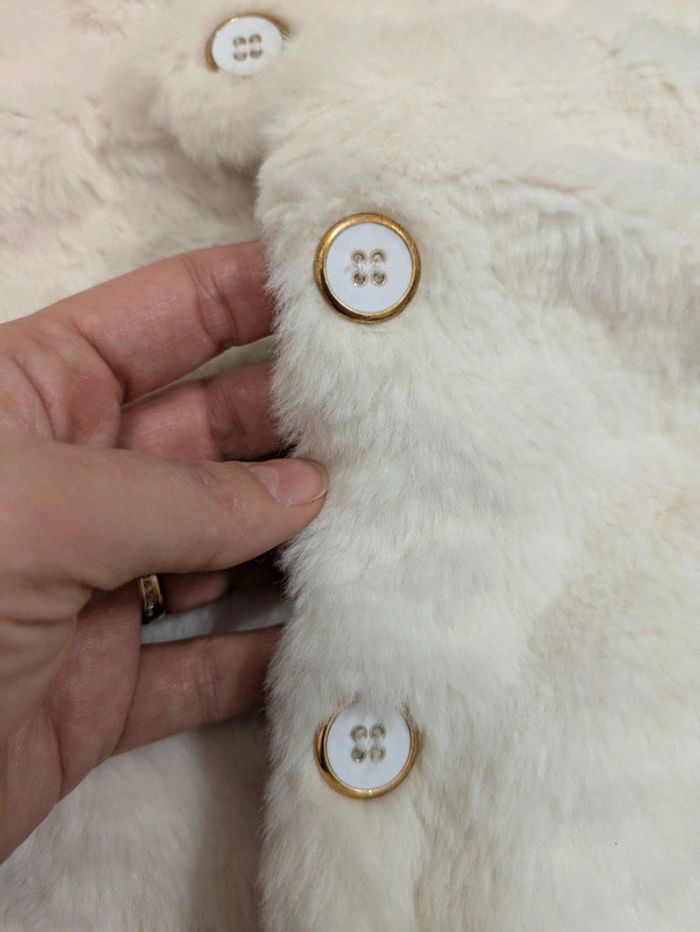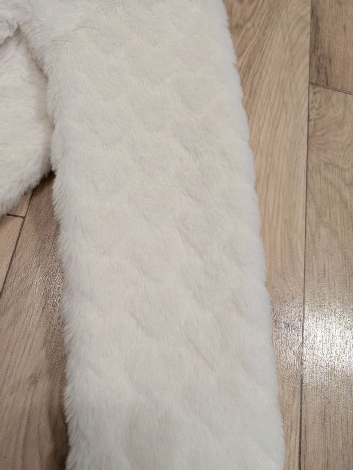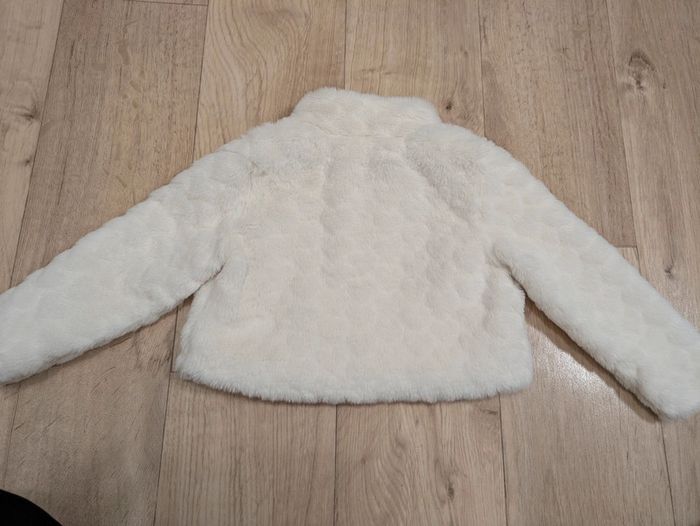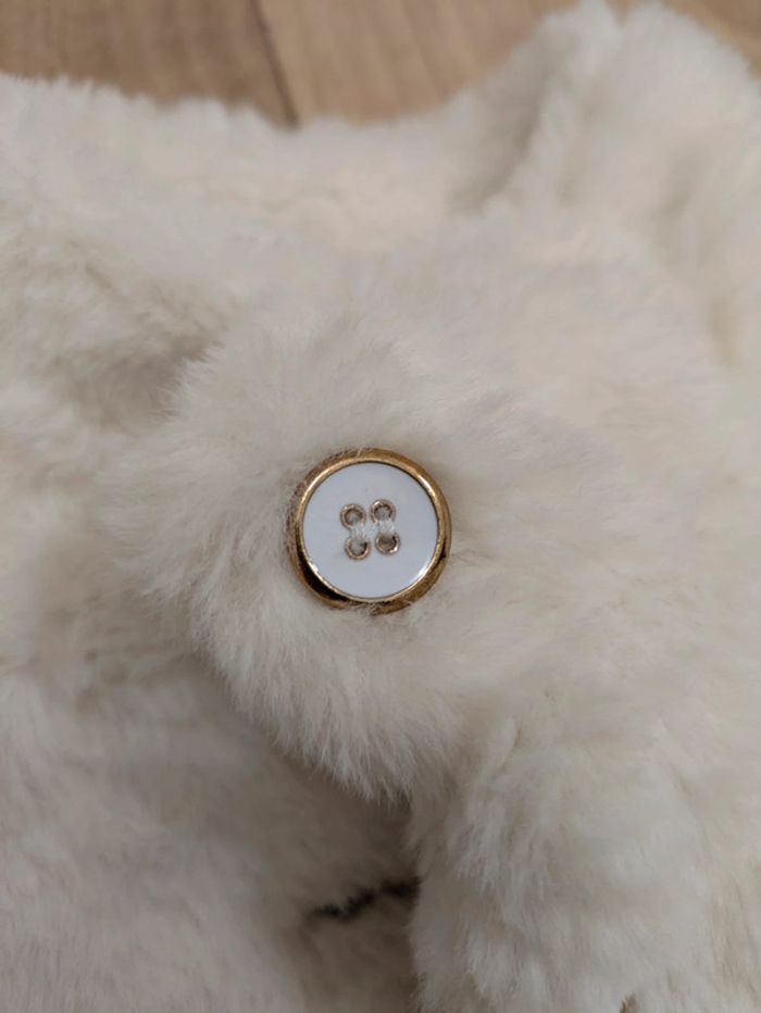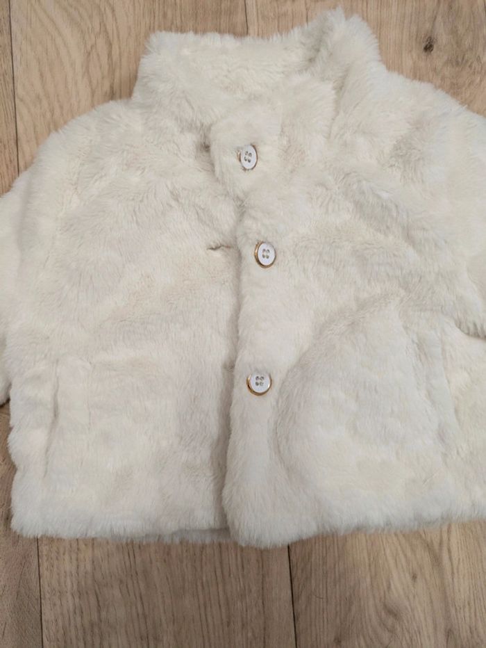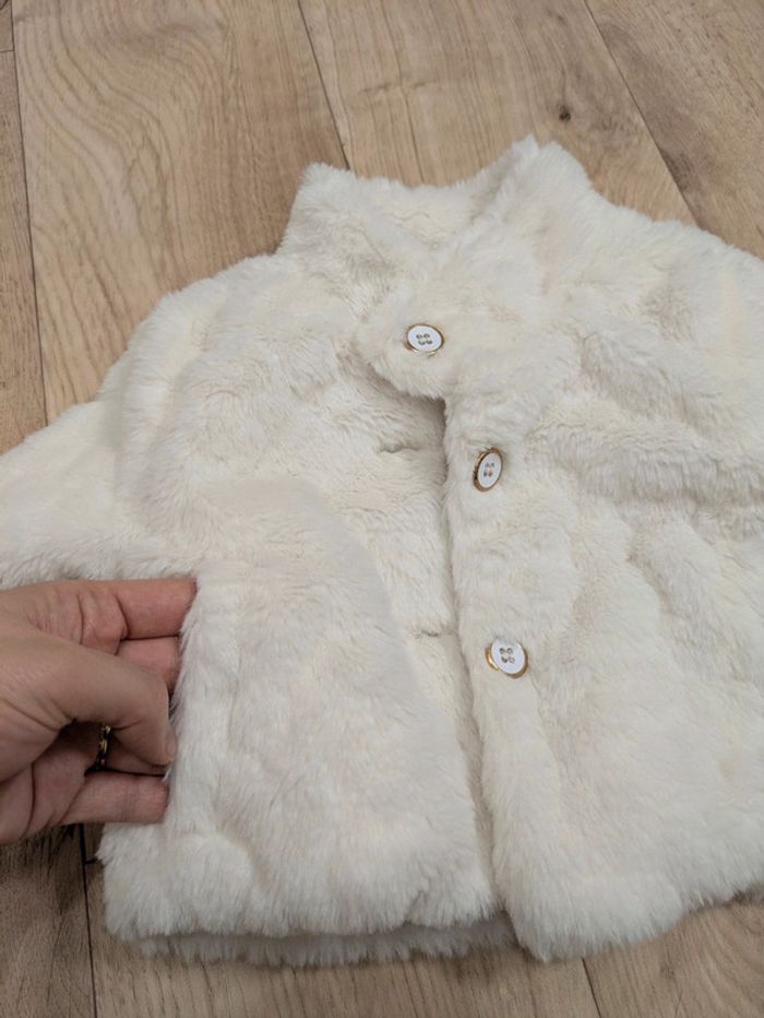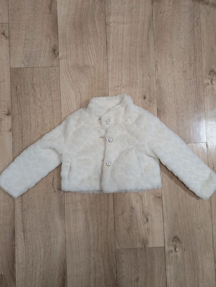 Comme neuf - Conforme aux photos. La moumoute forme des petits cœurs sur les manches. Marqué 86cm mais va jusqu'à 92cm facile (ma fille a pû la mettre presque jusqu'à 3 ans). Chaude, gilet court, magnifique sur les robes !