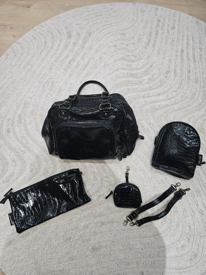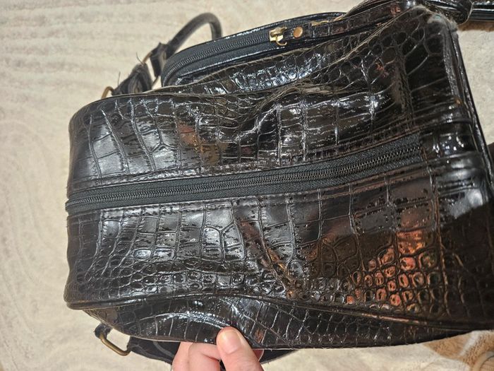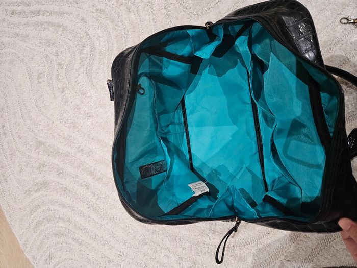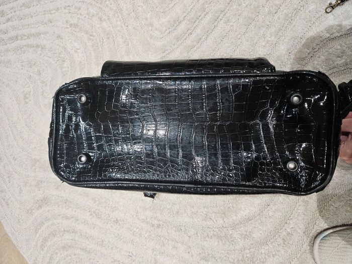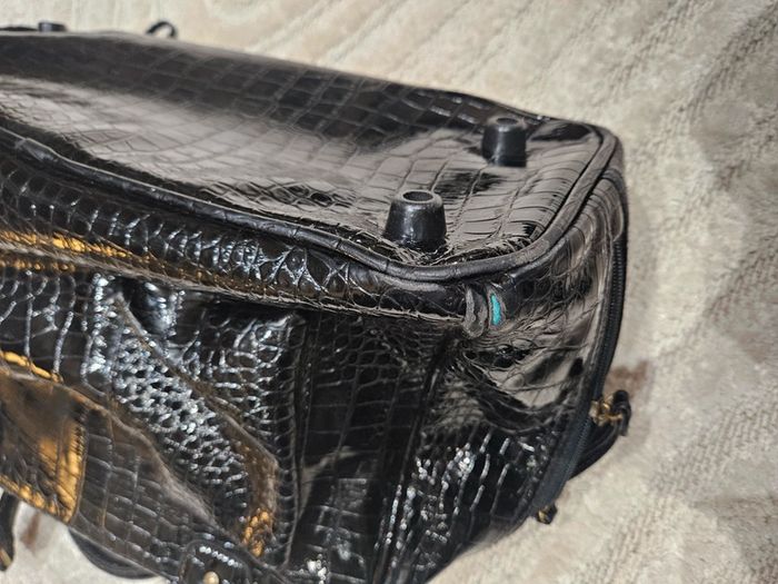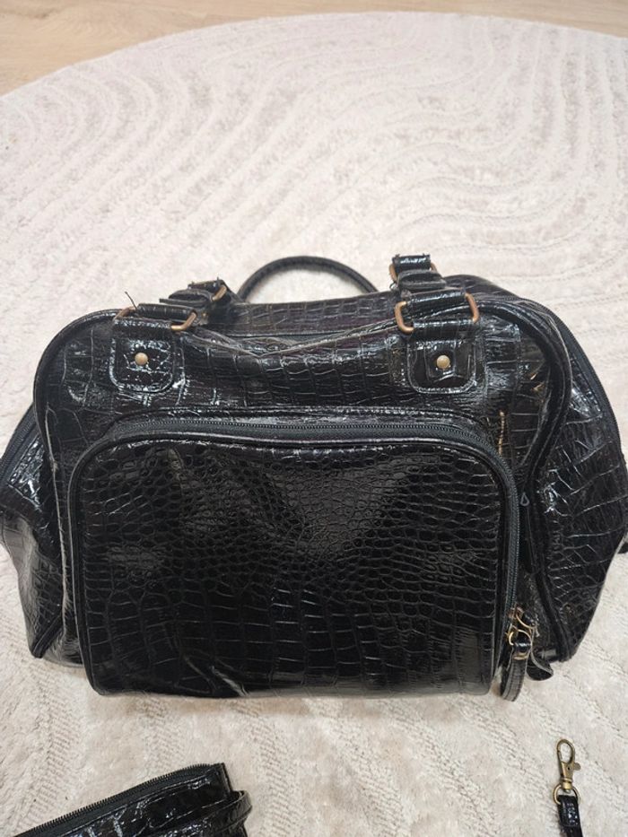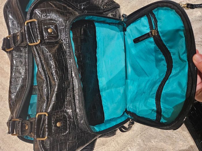 Sac à langer Baby on board noir motif crocodile. Comprenant: - une pochette isotherme pouvant contenir biberon et repas. - une trousse avec une grande contenance. - un porte clé qui peut s'attacher à l'intérieur du sac. - 2 attaches pour accrocher le sac à la poussette. Se trouve à l'intérieur plusieurs compartiments pour ranger facilement les affaires de bébé. Présente quelques marques d'usures, surtout sur le bas dans les coins (voir photos) mais reste malgré tout dans un bon état et est très résistant.