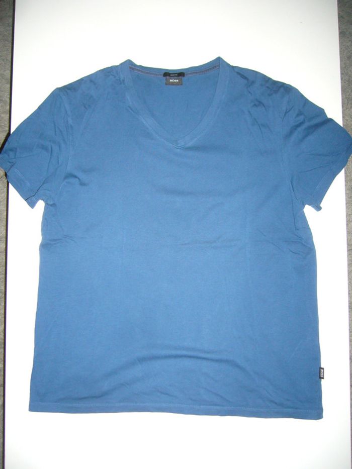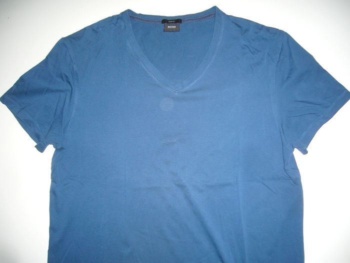 #hommesarah75015 tee shirt en coton fin, bleu, pour mi saison/été, col V, coupe slim fit, marque: BOSS, pour homme taille M, très propre, proche du neuf, sans aucun trous ni taches