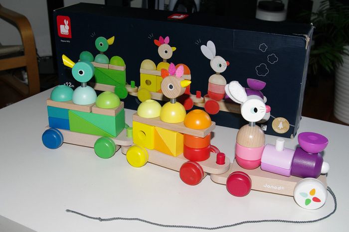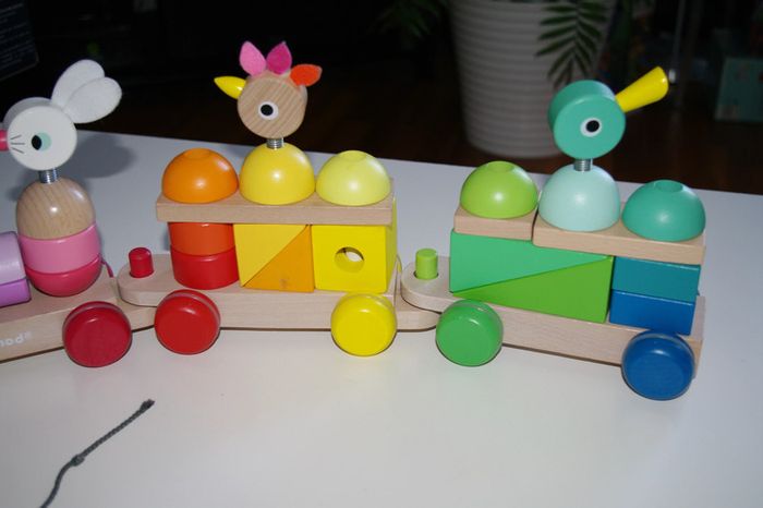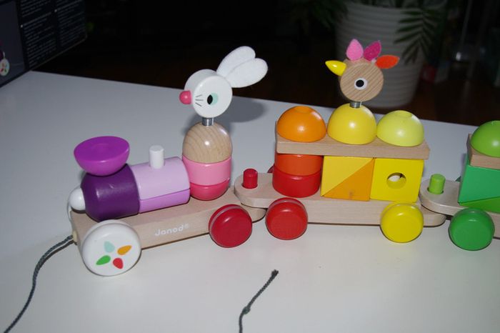 train géant multicolore zigolos, en bois, peinture à l'eau, marque: JANOD jeux d'éveil 2 en 1: *jouet à promener *jeux de construction avec 25 pièces à empiler de 12 à 36mois en très bon état, vendu dans sa boîte d'origine