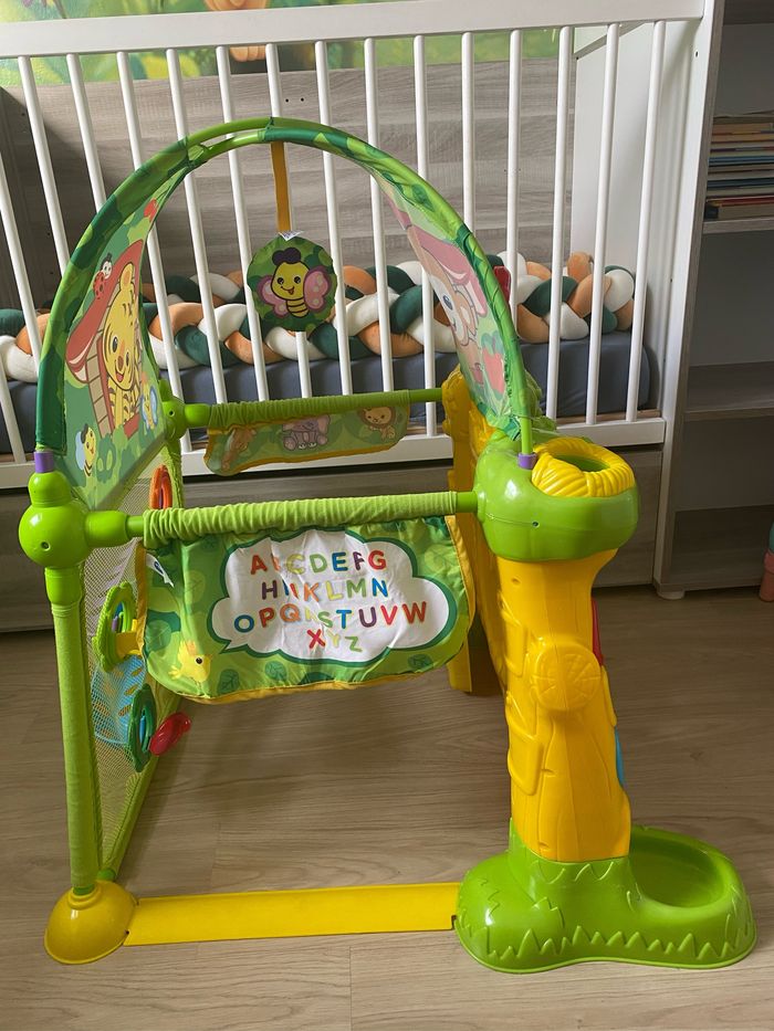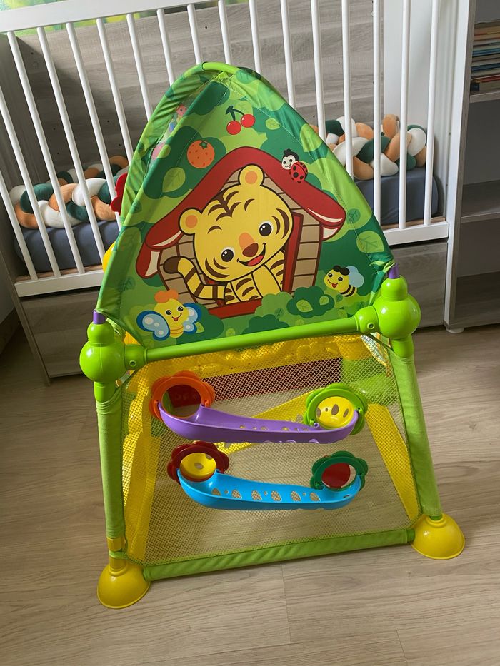 Descriptif produit : Que de bons moments en perspective dans la Magi Cabane interactive ! Bébé apprend et découvre en rampant, en s’amusant à faire dégringoler les balles, en insérant les formes ou en faisant tourner les roues de l’engrenage des 4 panneaux d’activités. Bébé développe ses capacités motrices mais aussi son vocabulaire, grâce aux capteurs magiques et au tableau d’activités interactif, qui lui font découvrir les couleurs, les chiffres, les concepts de la vie quotidienne ou l’invitent à jouer à cache-cache.