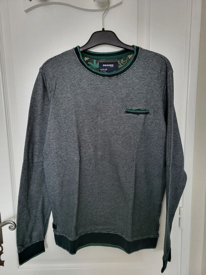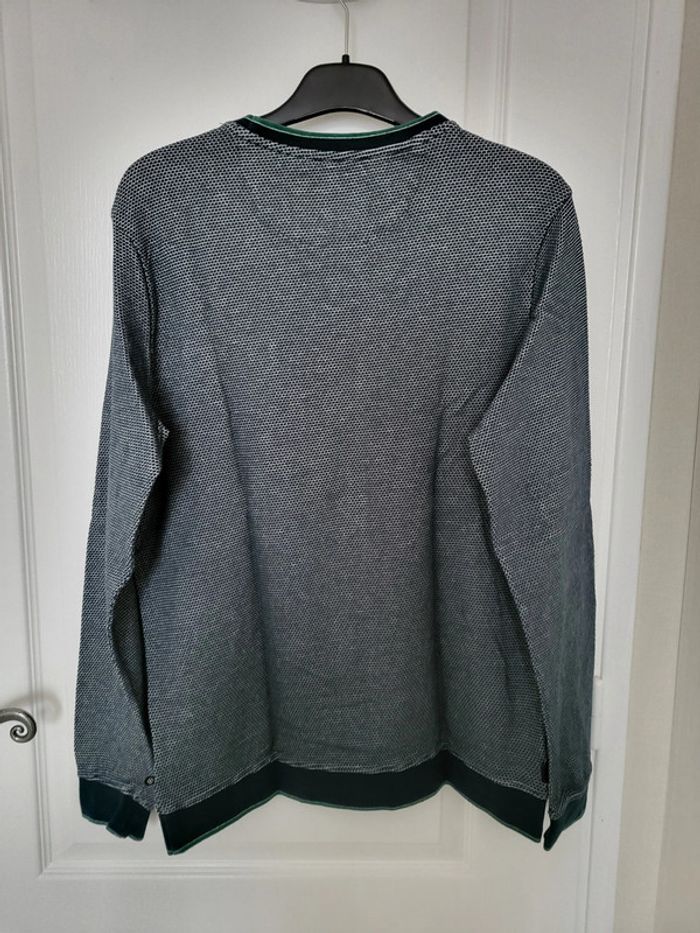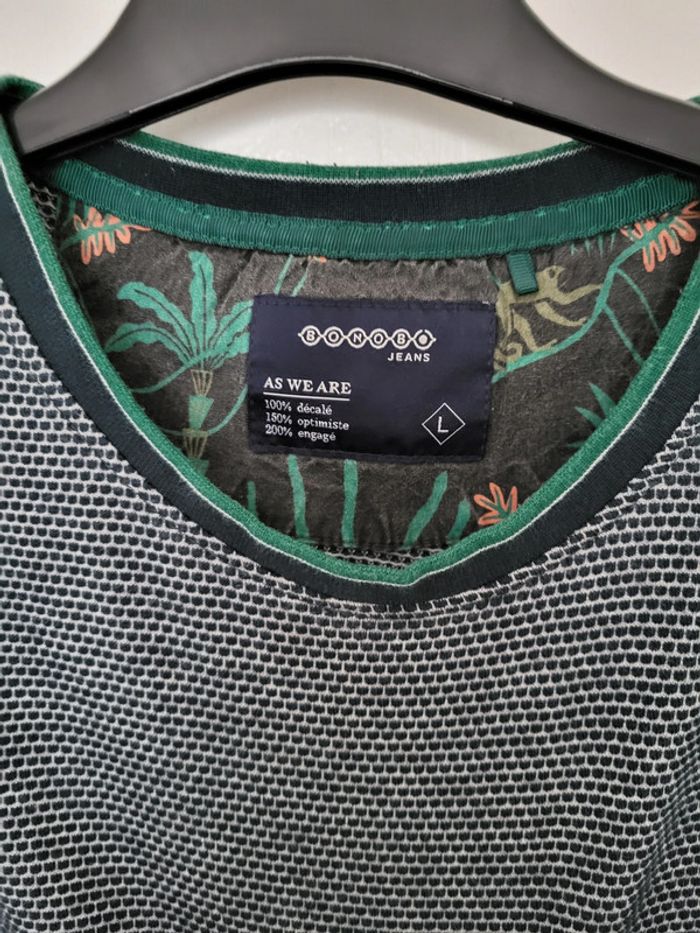 Pull bleu et blanc, touches de vert Bonobo Taille L #SILVVêtementsHtL