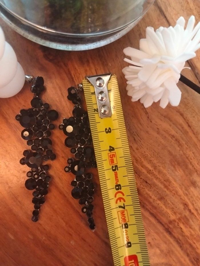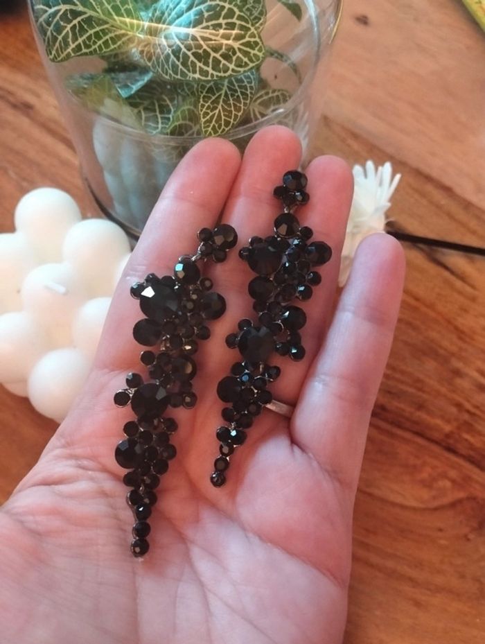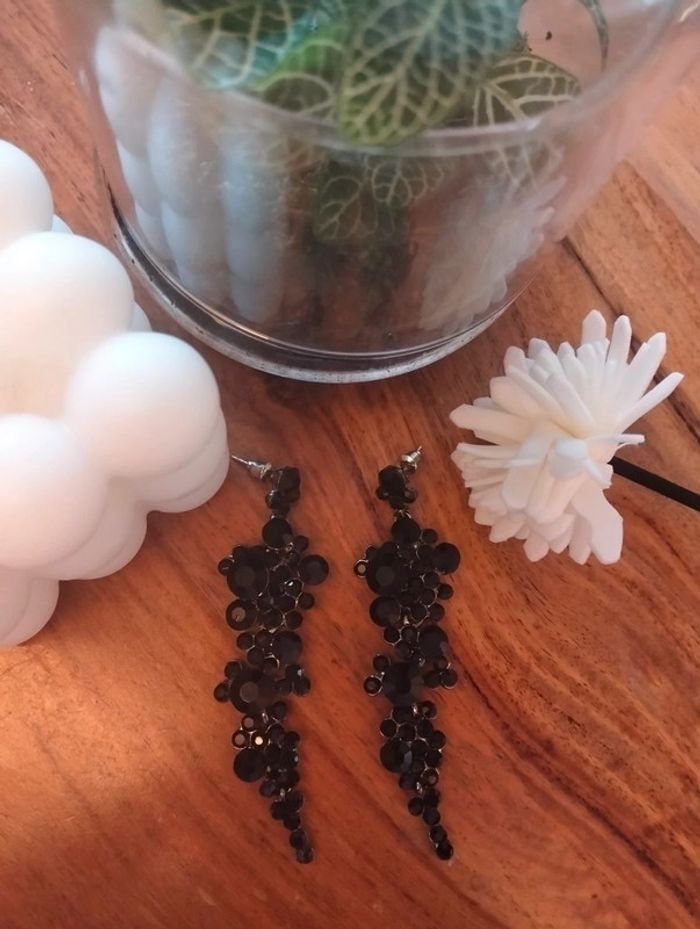 Sublimes boucles d'oreilles longues noires Multi strass noirs de tailles différentes Environ 8 cm - jamais portées Mes bijoux : #neidj2001bijoux Mes accessoires : #neidj2001accessoires