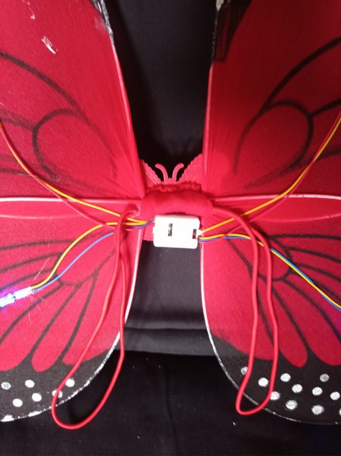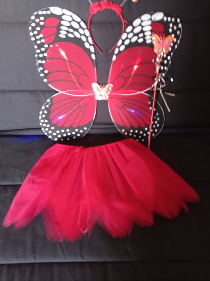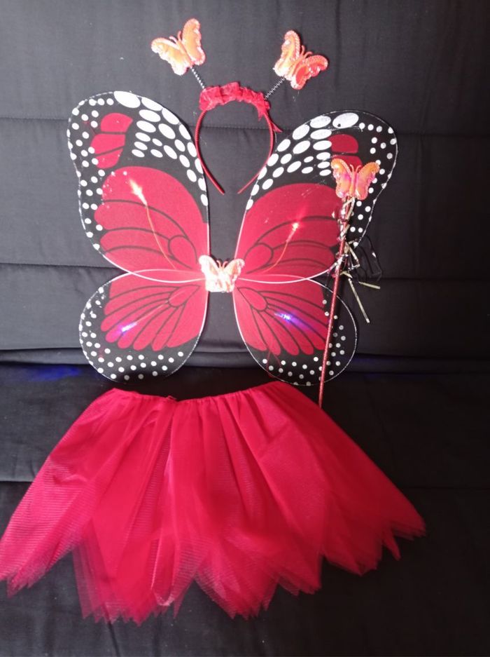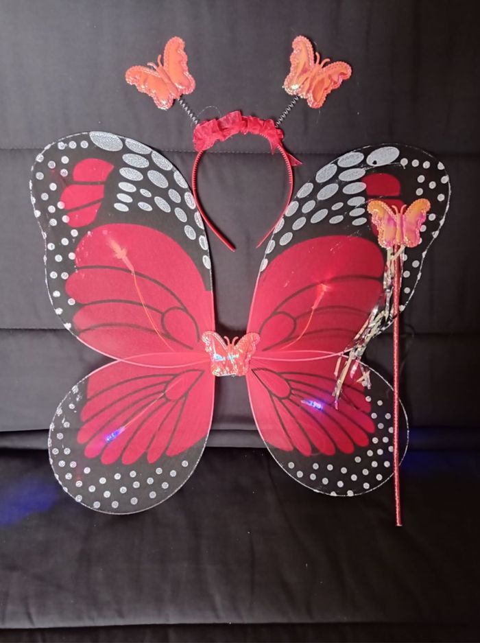 Déguisement papillon rouge à LED composé de 4 pièces, une jupe, les ailes de papillon (élastique à enfiler), une baguette et un serre tête. Jupe tutu élastique. Vendu neuf dans son emballage d’origine. Convient aux petites filles de 3-6ans. Expédition rapide après votre commande