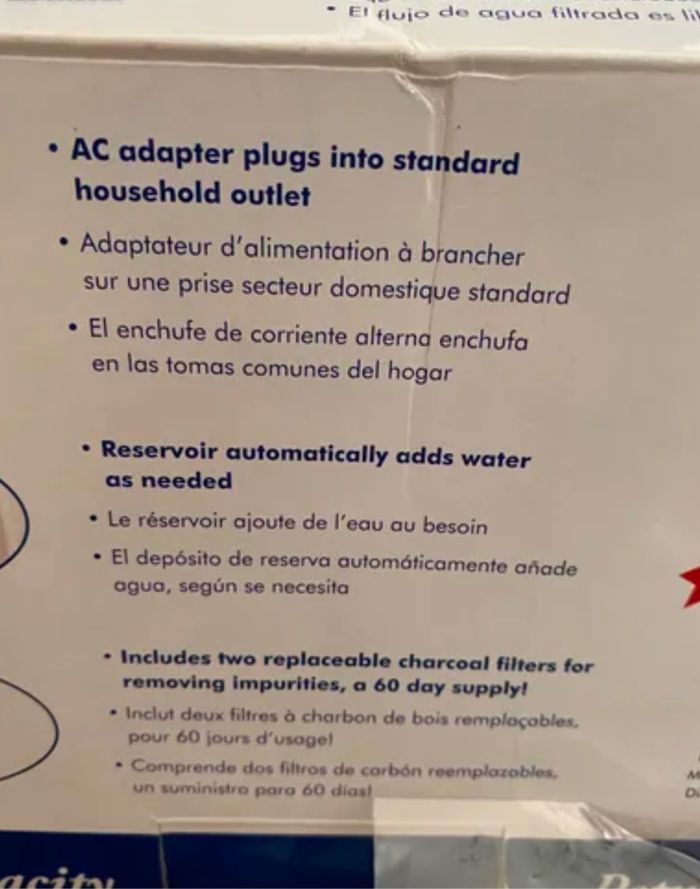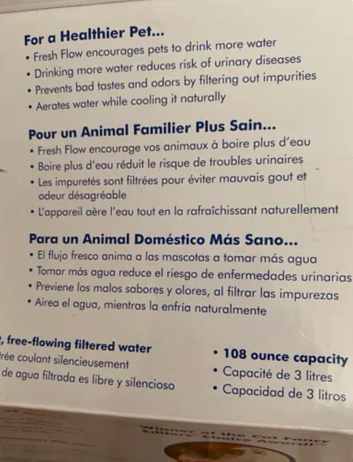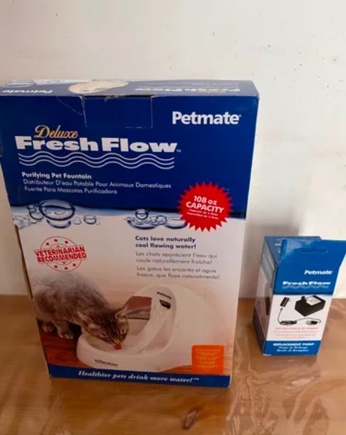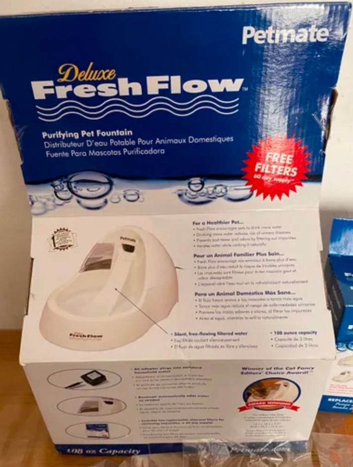 Fontaine à eau pour chat ou chien Capacité 3 litres Couleur beige Utilisé une semaine puis nettoyée et remise dans son emballage d'origine + pompe de rechange neuve et 4x 2 filtres de rechange neufs, de quoi tenir lan et demi sans devoir en racheter (2ans avec ceux fournit avec la fontaine)