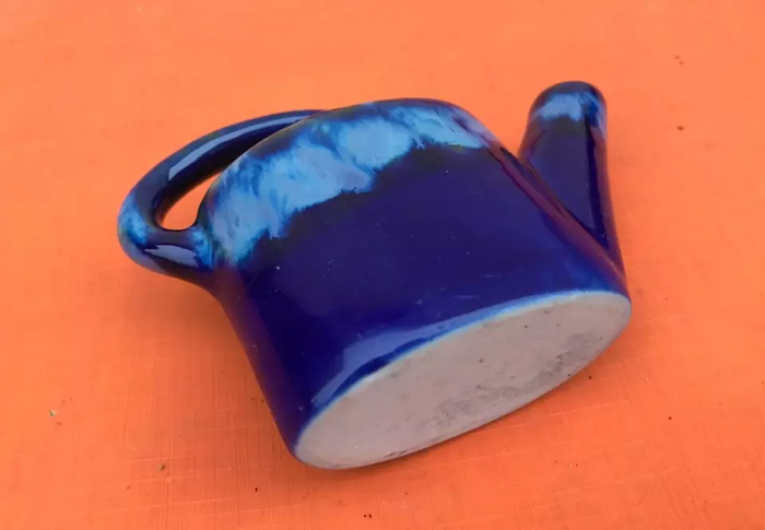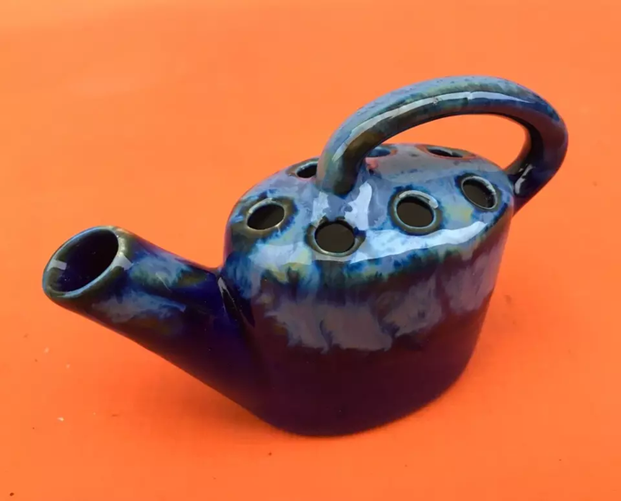 Années 1950 Bouquetière / Pique fleurs forme arrosoir Grès flammé " grand feu " dans le goût de Vallauris Hauteur : 75mm Longueur : 105mm Poids : 95grs