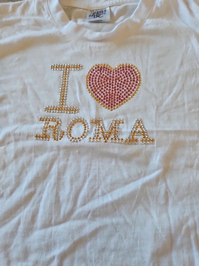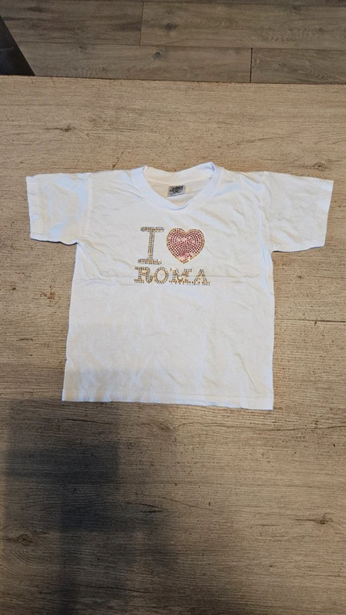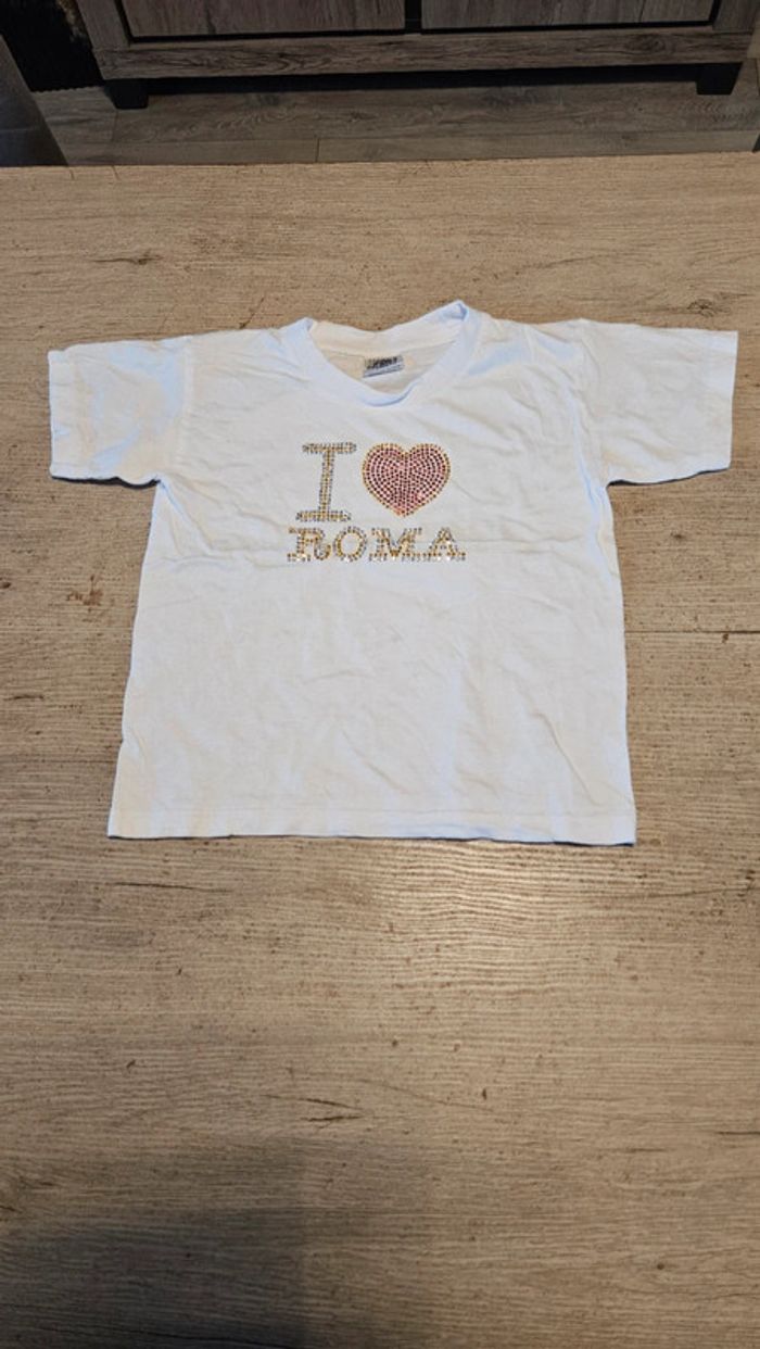 T shirt blanc manches courtes, col rond. Il a été très peu mis donc nickel. Inscription I ❤️ Roma en sequins. Convient bien pour du 5 à 6 ans #deborahtock_5ans #deborahtock_6ans