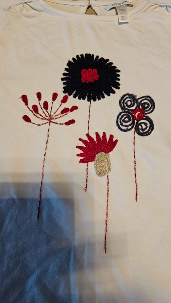 T shirt blanc à manches longues avec fleurs brodées, Okaïdi, 14 ans, peu mis - photo numéro 2