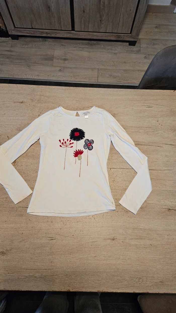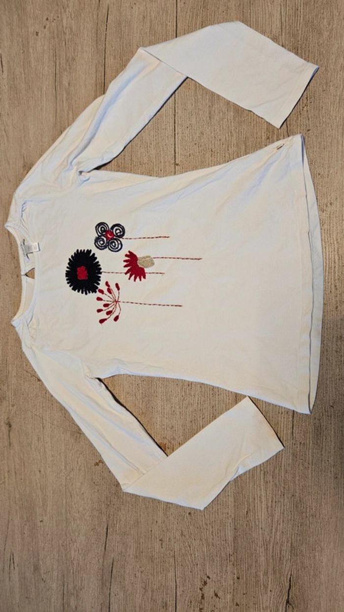 T shirt blanc à manches longues avec fleurs brodées, Okaïdi, 14 ans, peu mis - photo numéro 1