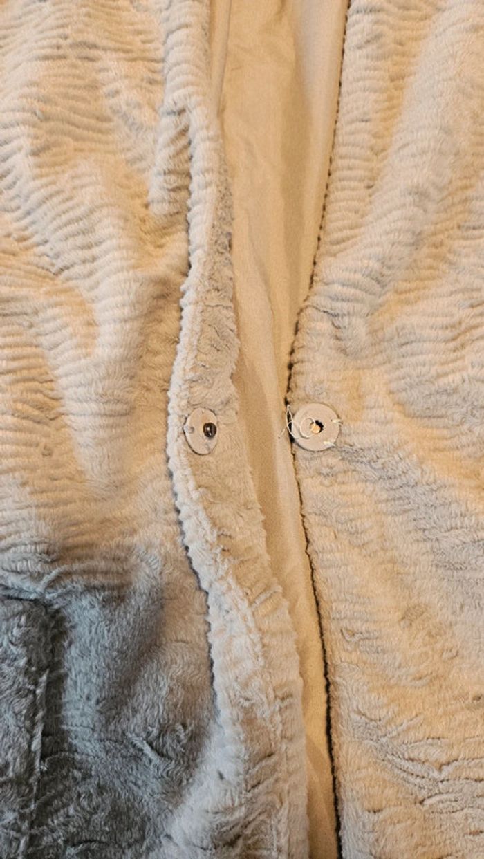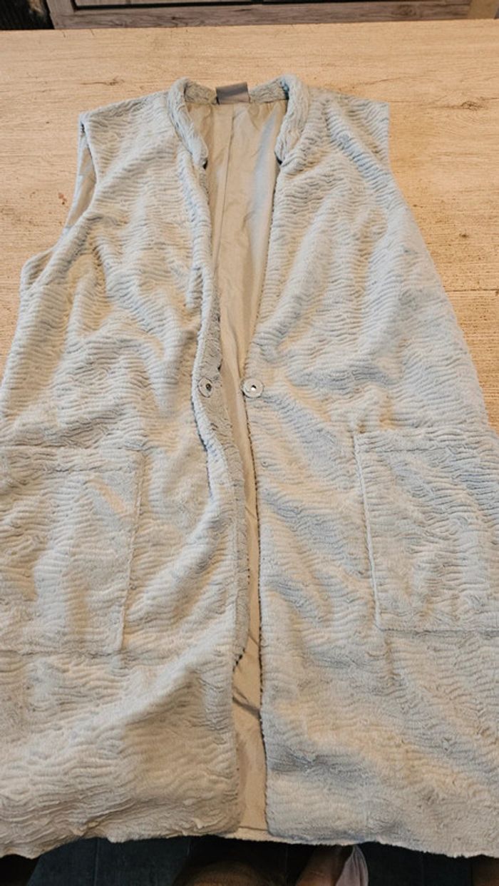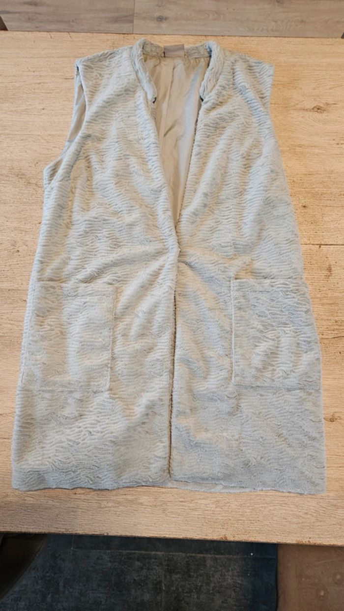 Gilet long, tout doux. Il est gris clair, tirant sur le turquoise. Avec poche de chaque côté. Peu mis. Doublé. Se ferme par 1 pression. Mesure 49 cm d aisselle à aisselle. Convient pour du 38 à 40 #deborahtock_femmeL