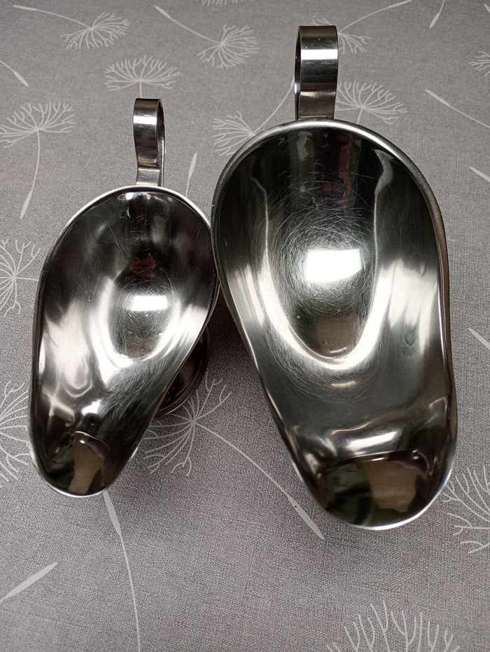 Lot de 2 saucières en inox. Petit et grand modèle. Petit : 17, 5 x 7 cm. Grand : 23 x 8 cm. Très bon état.