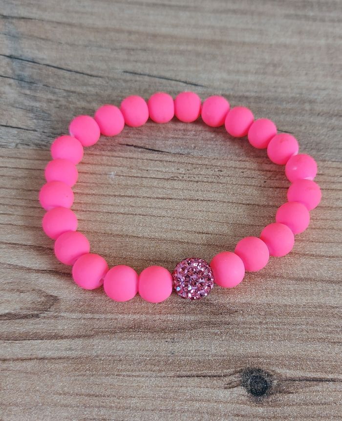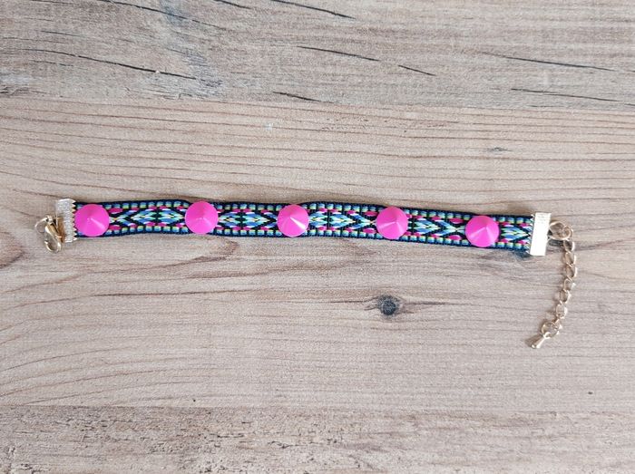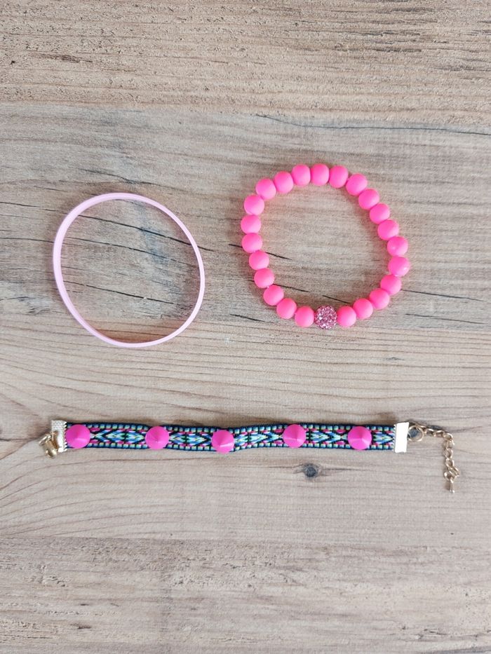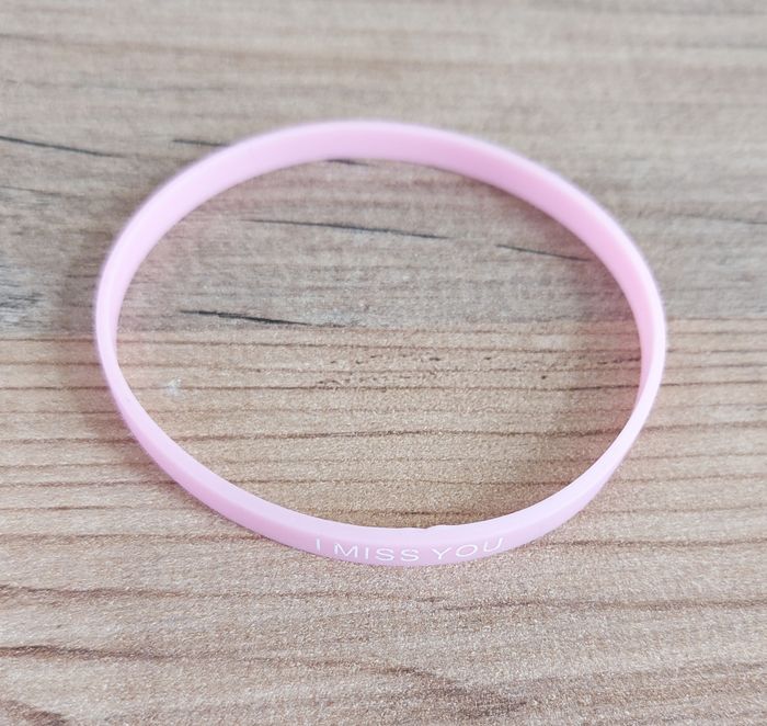 Je vends un lot de 3 bracelets, le lot comprends : - 1 bracelet rose en plastique avec l'inscription "I Miss You" - 1 bracelet élastique rose fluo - 1 bracelet en tissu multicolore avec des pointes rose avec une fermeture réglable Ils sont tous neufs, jamais mis.