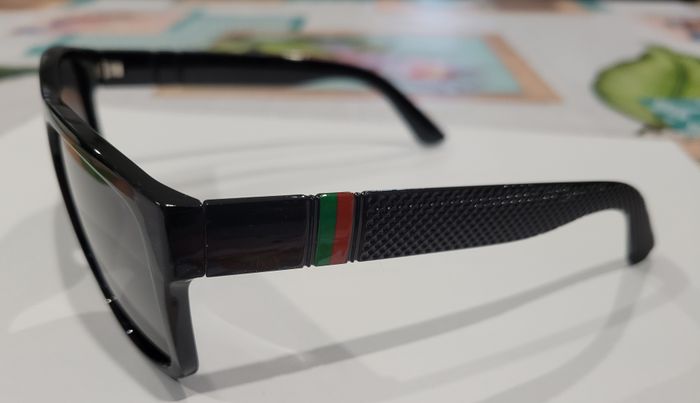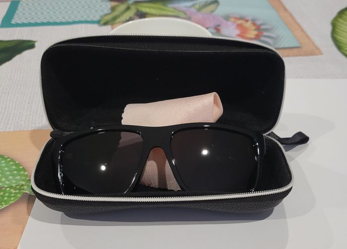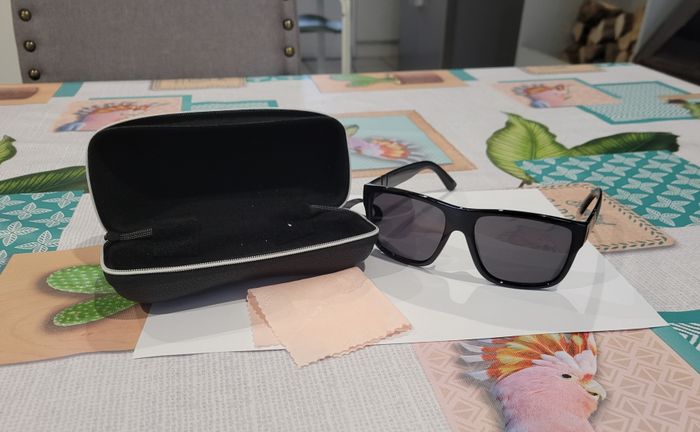 LUNETTES DE SOLEIL HOMME VERRES POLARISES ! NEUF paire de lunette de soleil pour homme. Verres polarisés. Monture noire en plastique texturé + bandes rouge et verte.. Verre teinté noir. Neuf. Livré avec son etui et sa chifonnette microfibre. Envoi rapide et bien protegé .