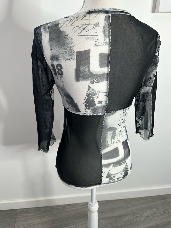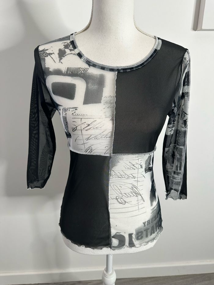 Top - Excellent état - Taille 38 équivalent M - Noir et blanc - Imprimés damier - Manches 3/4 - Style Y2K années 2000’ - Col rond - Tissus transparent - Plus d’étiquette de taille ni de matière Dimensions: - 40 à 52cm niveau aisselles - 58cm de long #rock #emo #damier #y2k
