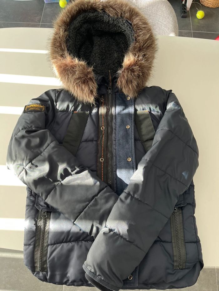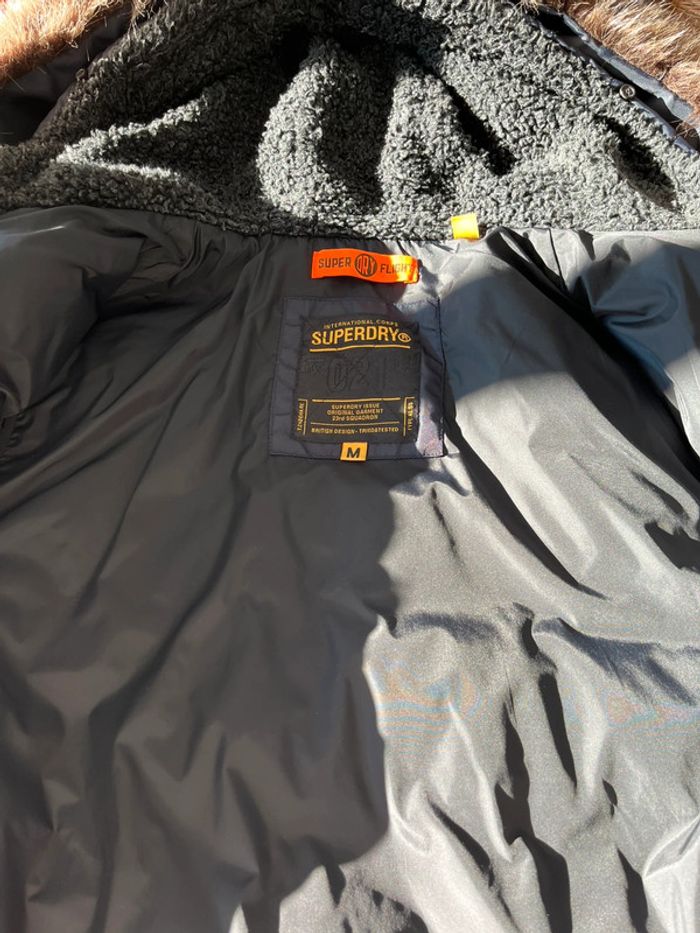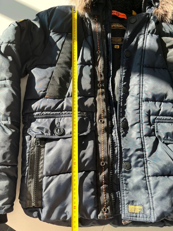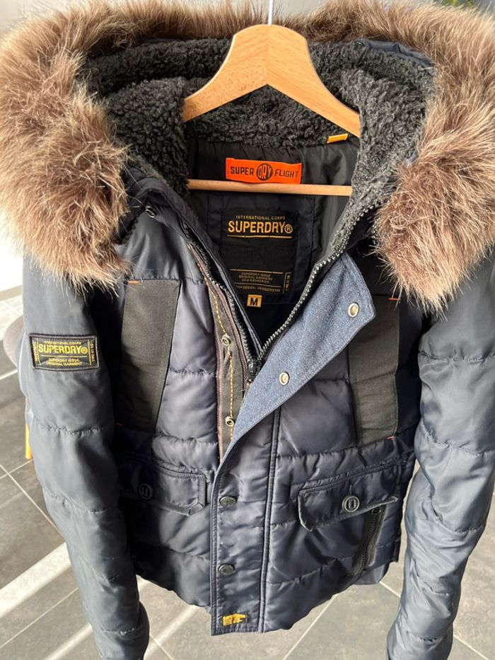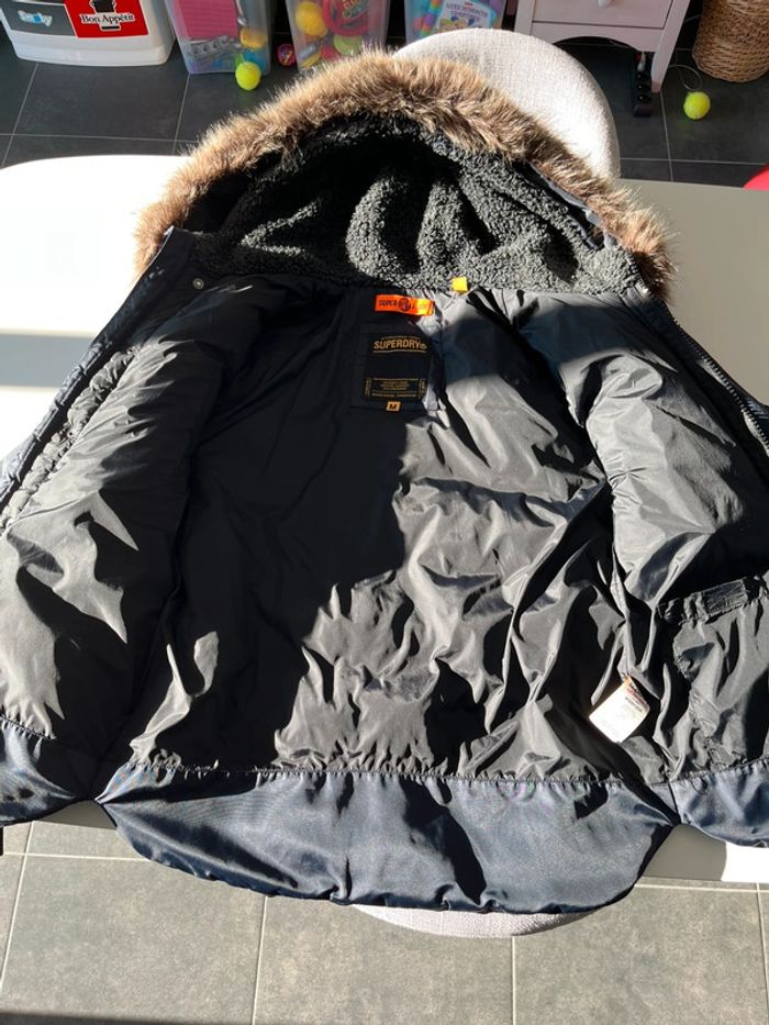 Doudoune superdry taille M Foufure de la capuche détachable Longueur 64cm Largeur aux aisselles 57cm Taille des manches 65cm Poche intérieur légèrement décousue sur un côté (voir photo)