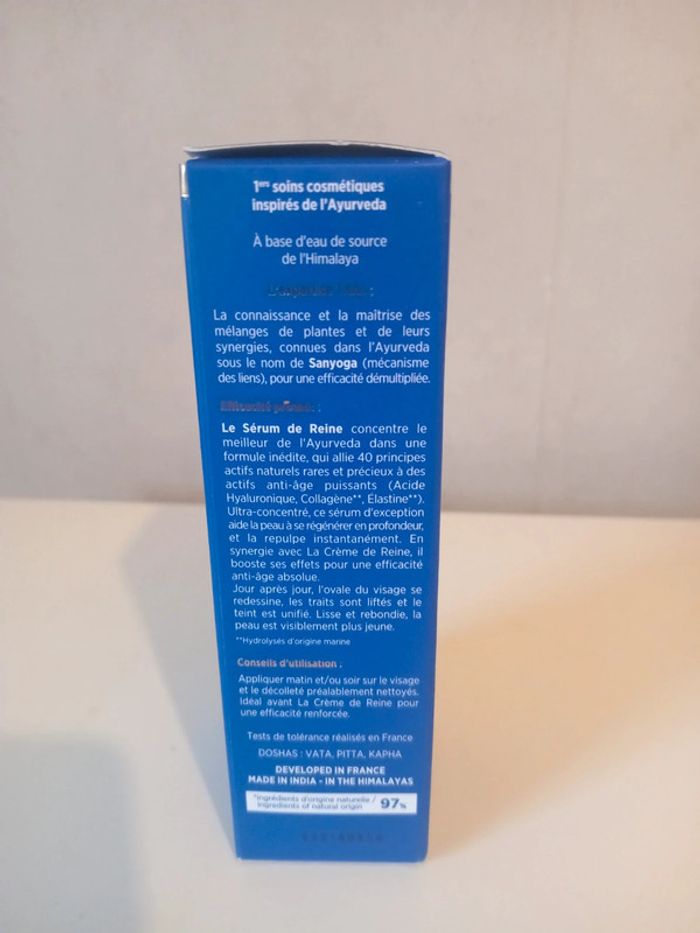 1 ers soins cosmétiques inspirés de l'Ayurvéda , le Sérum de Reine concentre le meilleur de l'Ayurvéda dans un formule inédite, qui allie 40 principes actifs naturels rares et précieux à des actifs anti-âge puissants ( Acide Hyaluronique, Collagène, Elastine ... )