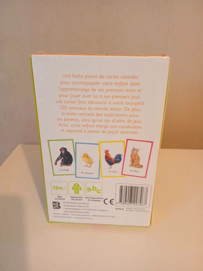 Neuf sous emballage Une boite pleine de cartes colorées pour accompagner votre enfant dans l'apprentissage de ses premiers mots et pour jouer avec lui à ses premiers jeux. Les cartes font découvrir à votre tout-petit 100 animaux du monde entier . De plus la boite contient des explications pour les parents, ainsi qu'un tas d'idées et je jeuxAinsi votre enfant élargit son vocabulaire et apprend à penser de façon abstraite Age conseillé 12 mois et plus Développement du langage