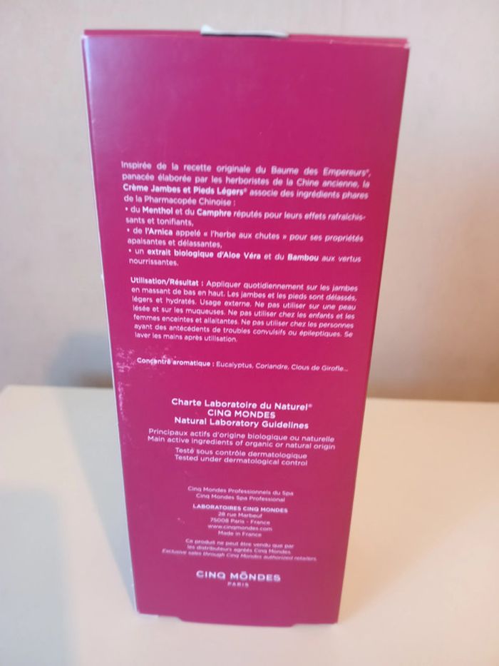 Neuf sous emballage Inspiré par la recette originale du Baume des Empereurs®, véritable panacée élaborée par les herboristes de la Chine ancienne, la Crème Jambes et Pieds Légers® contient des ingrédients phares de la Pharmacopée chinoise : > le Bambou qui stimule la synthèse de collagène. > l’Arnica pour soulager la douleur. > le Menthol associé à du Camphre qui rafraîchit et tonifie. > des extraits biologiques d’Aloe Vera pour une hydratation optimale des couches supérieures de l’épiderme.Les jambes et les pieds sont délassés, légers et hydratés. Idéal pour les jambes lourdes.
