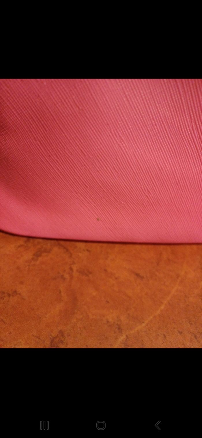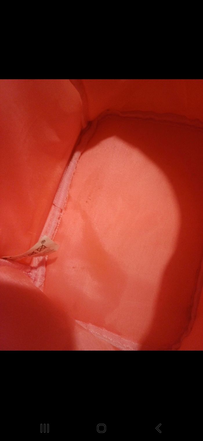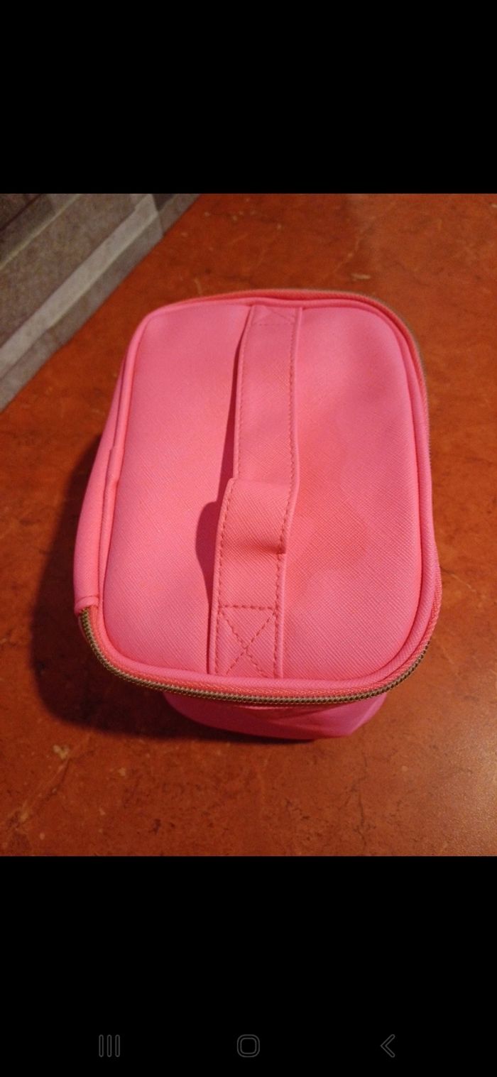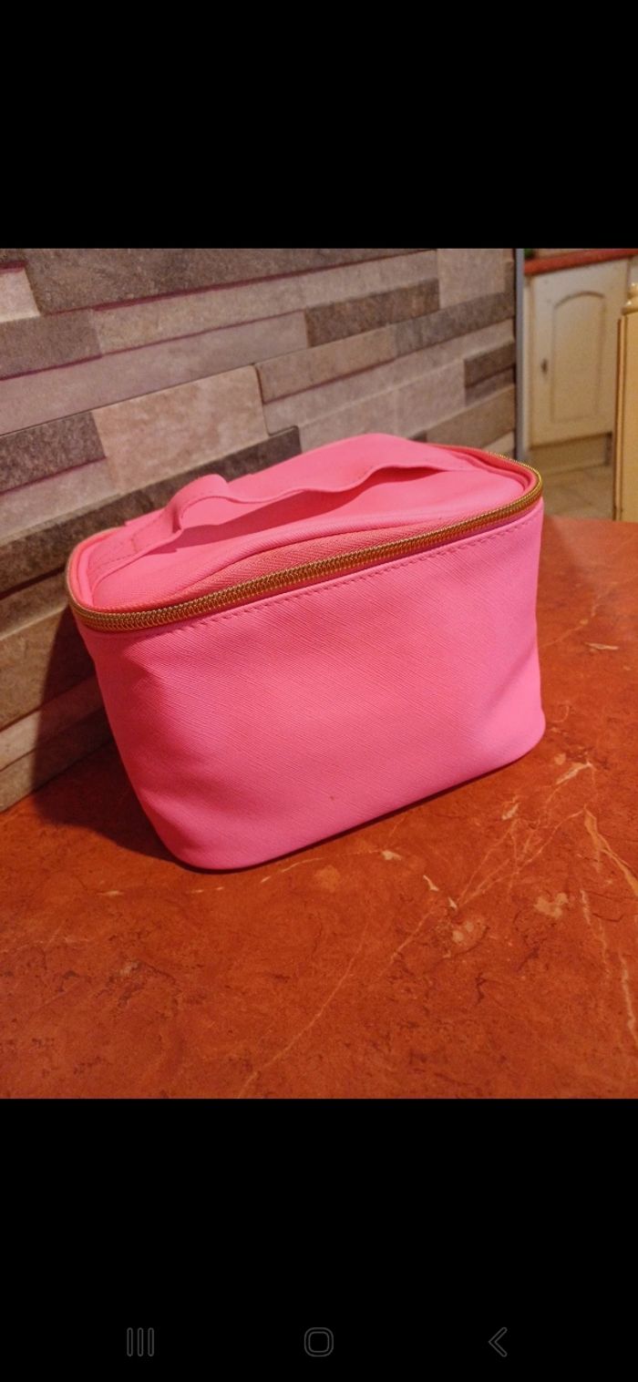 Vanity rose fluo avec fermeture éclair dorée qui fait tout le tour. Petit défaut devant sur le cuir et taché à l intérieur. Dimensions 20 / 14 / 12 cm environ