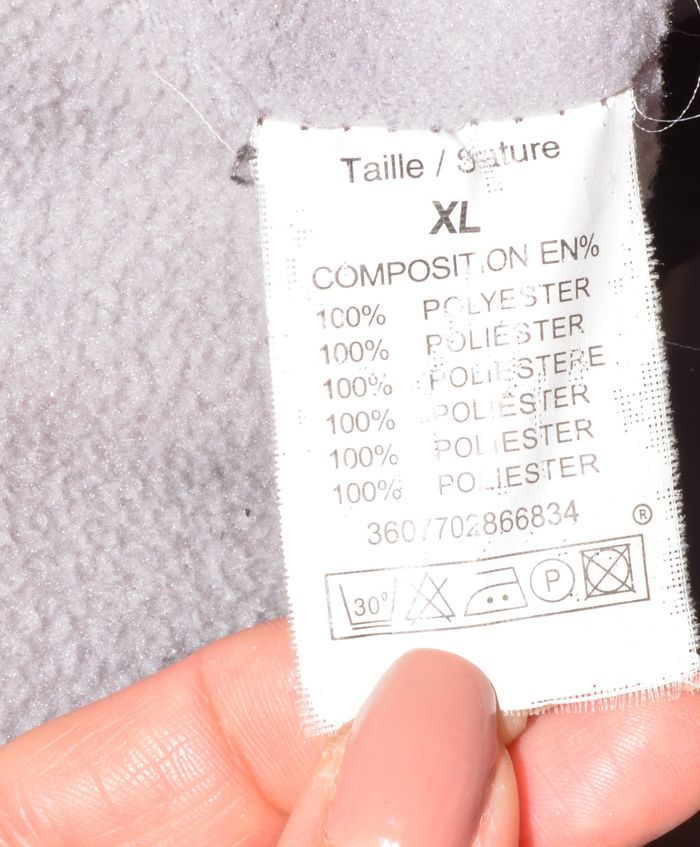 100% polyester épaule à épaule 55 cm aisselle à aisselle 64 cm au niveau des hanches 64 cm longueur 75 cm longueur des manches 69 cm