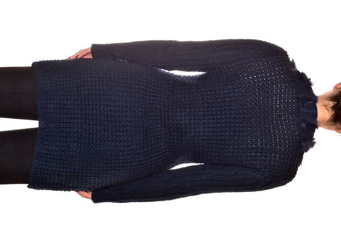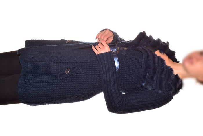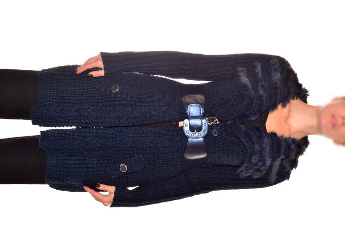 Long gilet bleu uni ajusté manches longue acrylique col V semi ouvert ceinture intégrée S/M - photo numéro 6