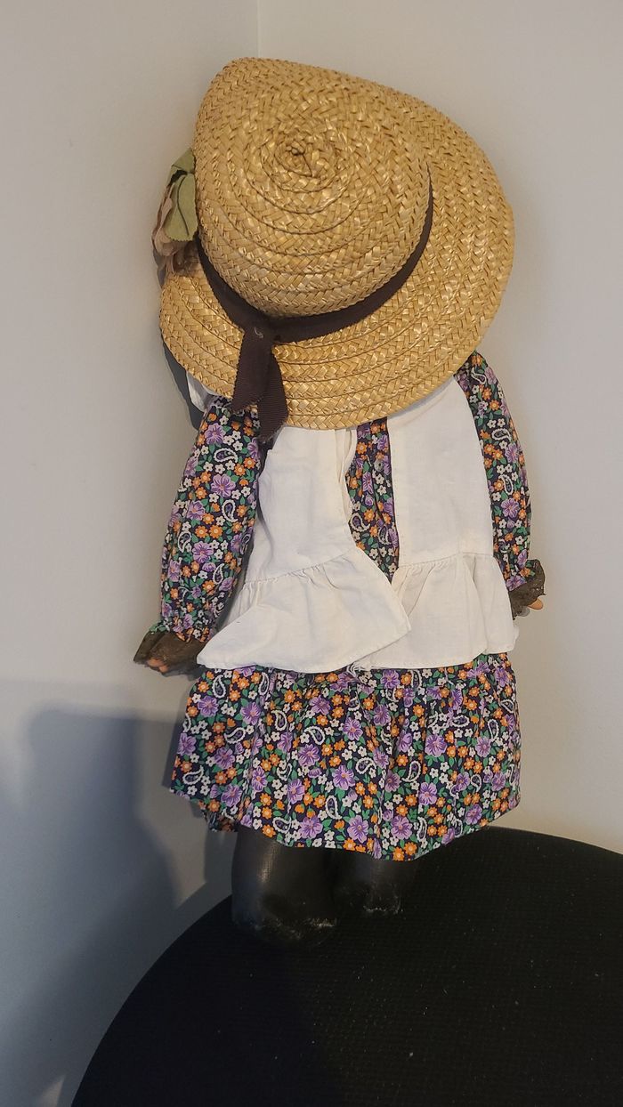 Jolie poupée Seki Guchi japonaise vintage des années 70. Corps souple en tissu, tête en plastique. Comme le Kiki de la même marque elle suce son pouce. Jolie tenue de petite fille modèle: robe, culotte et chapeau de paille.