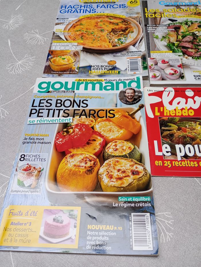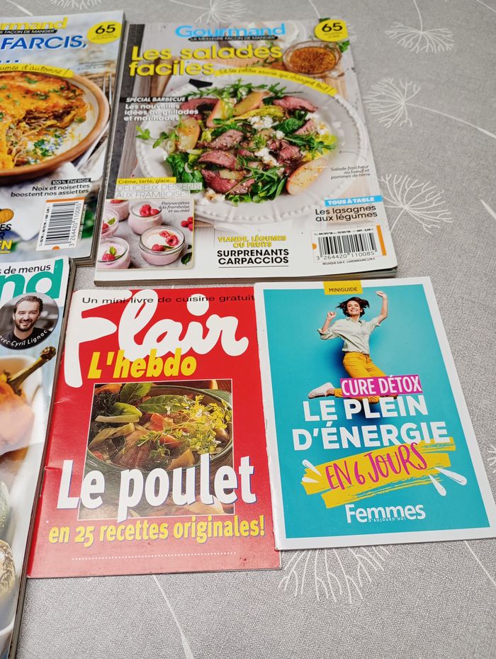 Lot de 3 magazines "Gourmand : Inspiration cuisine". + Livret "Cure détox : le plein d'énergie en 6 jours". + Livret "Le poulet en 25 recettes originales". Très bon état.