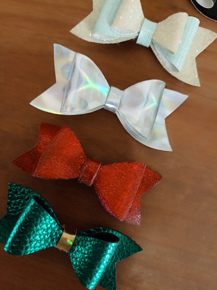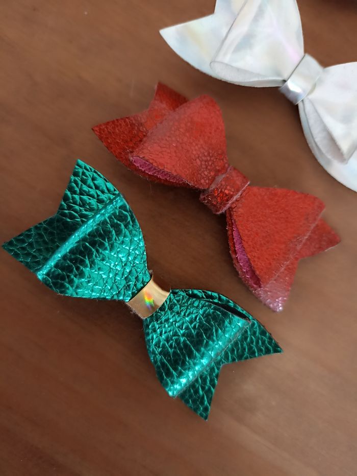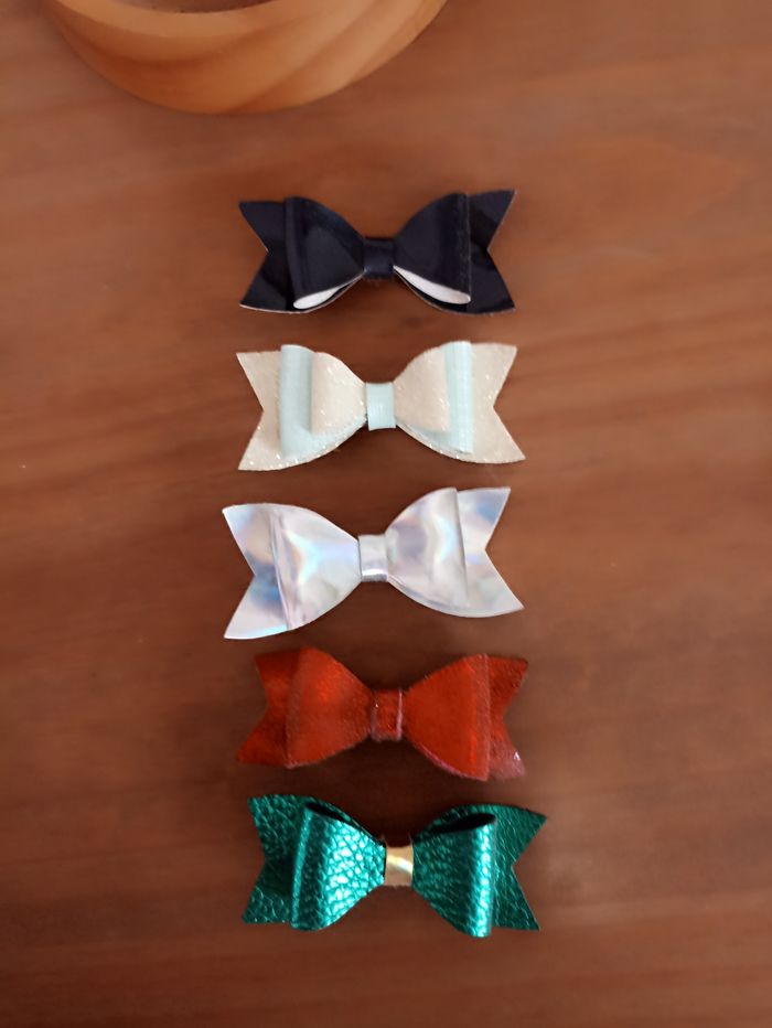 Lot de 5 barrettes en similicuir 1 noir reflet bleu 1 double nœud paillettes et bleu ciel 1 argent 1 rouge 1 verte Pince crocodile Utilisé 3/4 fois #pinceacheveux #barrettenoeud