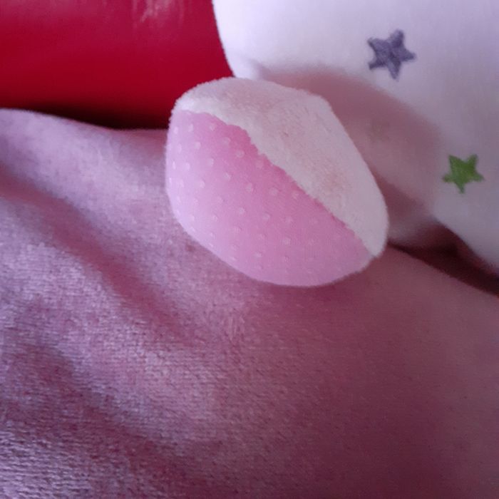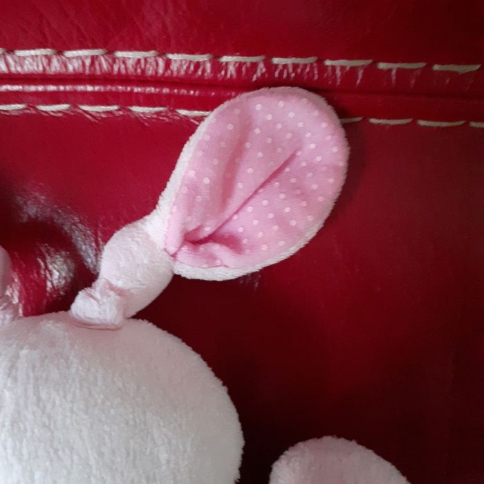 Doudou Lapinou, marque Nicotoy. Entièrement rembourré; yeux et pommettes brodés; broderie devant; oreilles doublées et idéales pour mâchouiller. Coloris blanc, rose pâle et rose layette. Hauteur maxi de 24,5 cm // voir photos pour détails